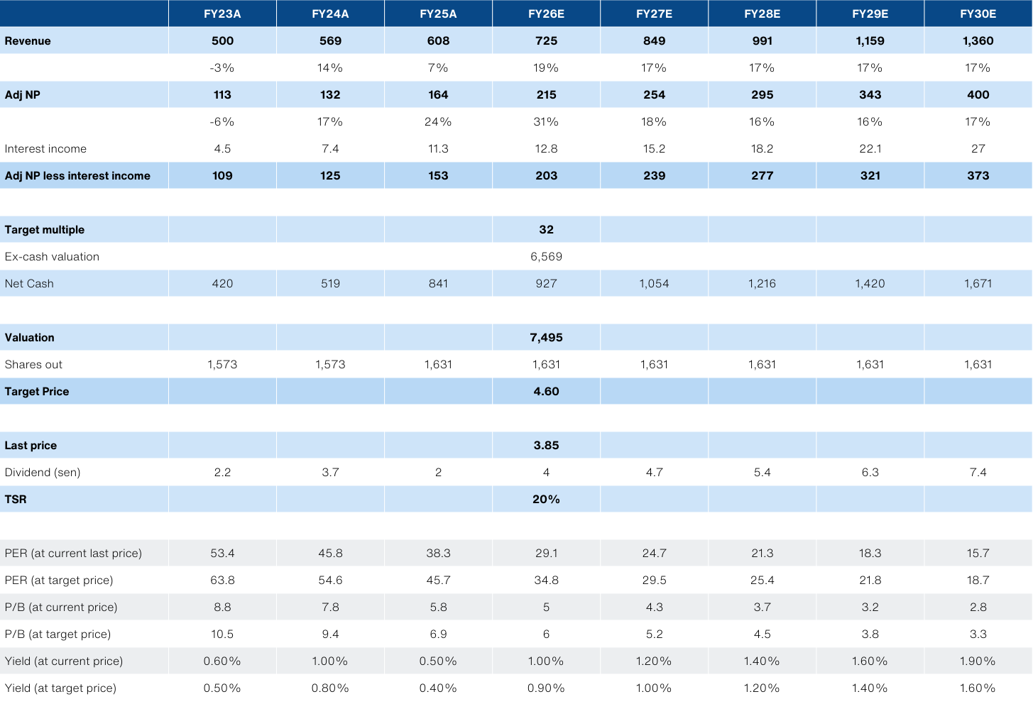 - Given the strong ringgit outlook for 2026, we trim our FY26/27 Adj NP by -5%/-6% for FY26/27. We lower our TP to RM4.60 on a lower target multiple of 32.4x (3yr average, BF12M).
