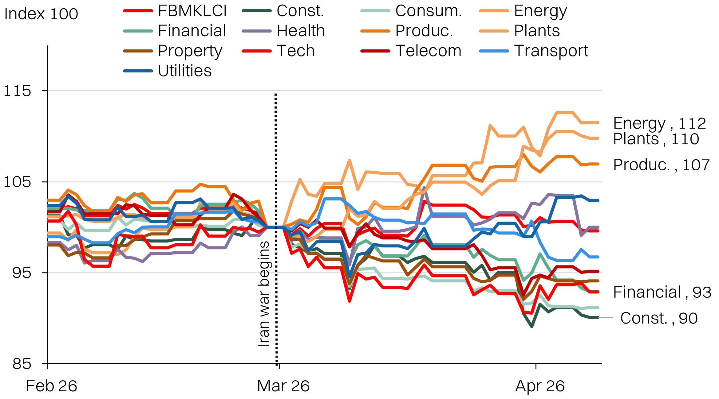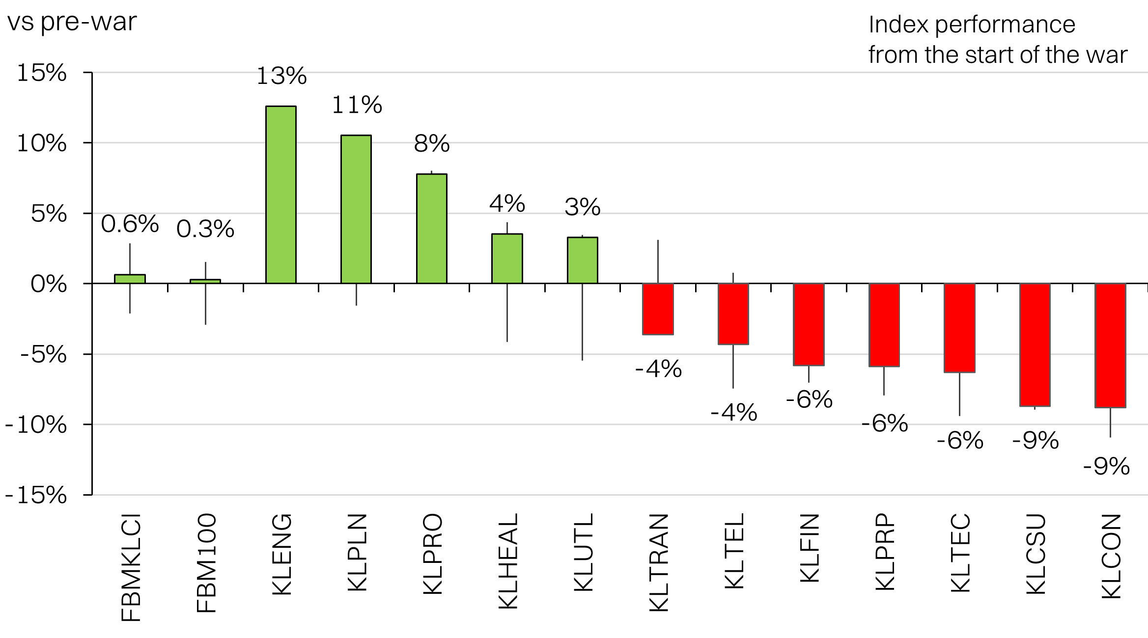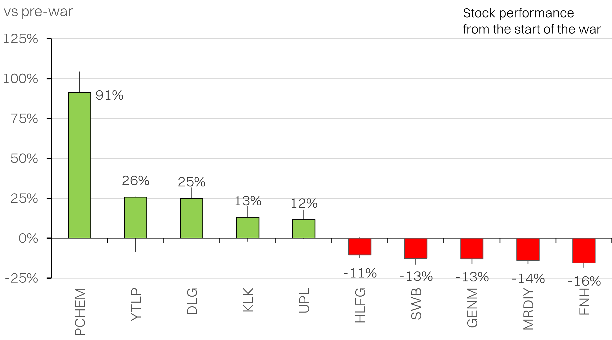 - Outlier sectors have been energy (+13%), plantations (+11%) as well as construction (-9%). Among large caps, PCHEM stands out the most (+91%), on the fertilizer price surge. Notable losers include AAX (-37%) on higher jet fuel prices.