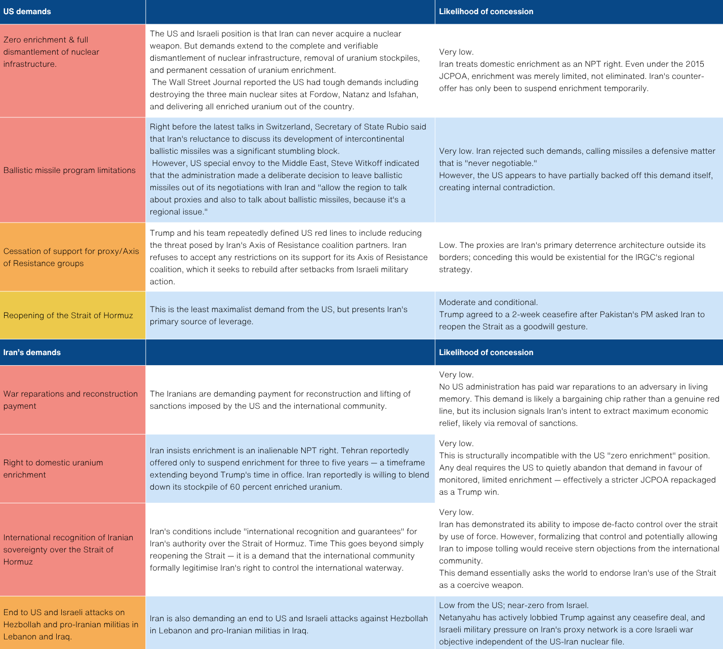 We have organized the key demands from the US and Iran from most to least maximalist. The biggest hurdle, relatively, appears to be the structural impasse on uranium enrichment. Either side will find it highly challenging to reverse its publically stated position. Comparatively, the other demands have more wiggle room to negotiate. Another key stumbling block in the negotiations is Israel, which has its own maximalist agenda and has demonstrated much less willingness to engage with Iran.