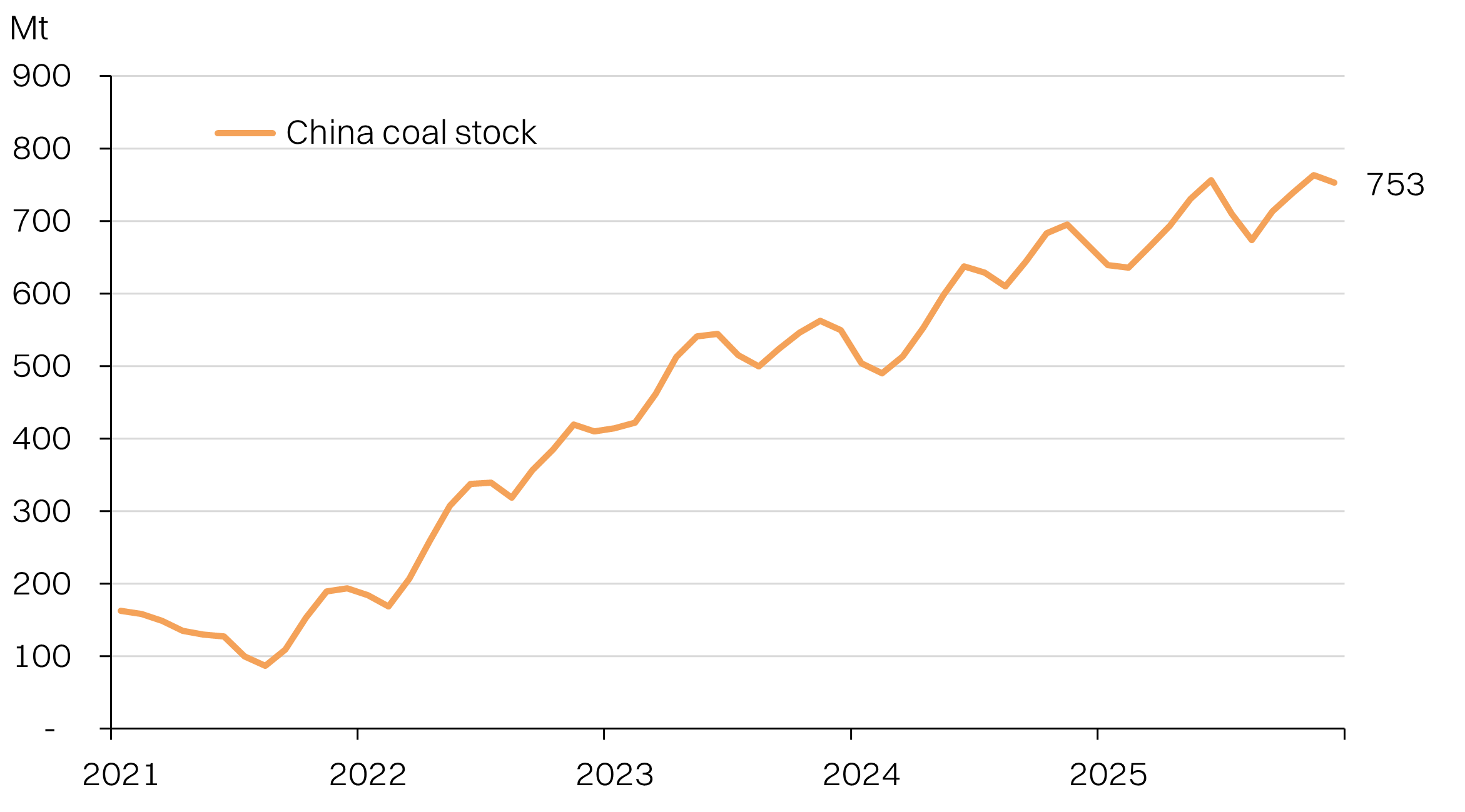 China’s coal consumption began to plateau in 2024, as the share of coal power in the generation mix fell to a low of 54.8%. This is down from 57% in 2020 - a trend that is expected to persist. Additionally, China has domestic coal production. The rising bunker fuel prices will drive up the cost of shipping the coal to China this year, improving the relative competitiveness of domestic coal. Finally, China’s coal stocks are also at a historically high level. As of December 2025, it stood at 753Mt.