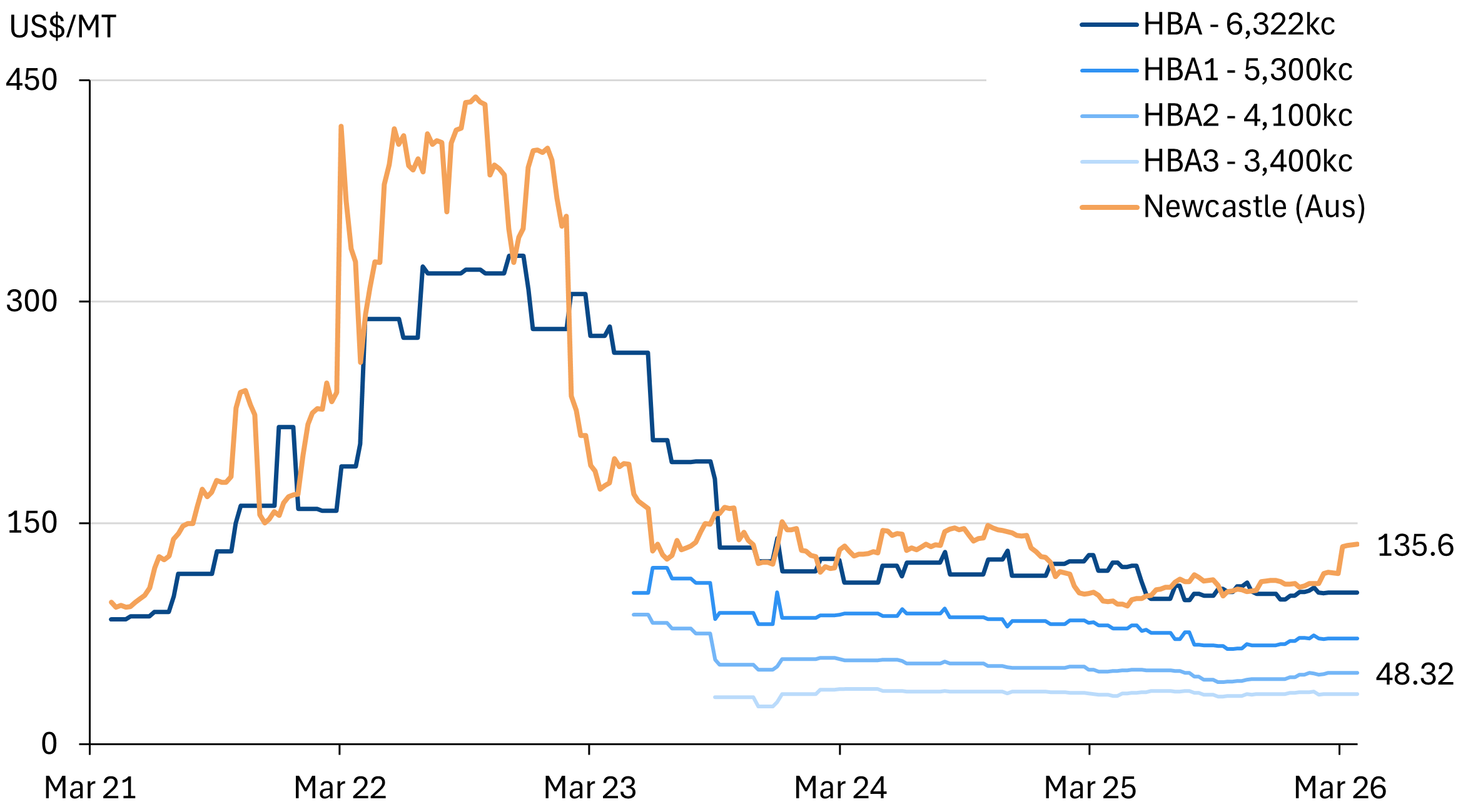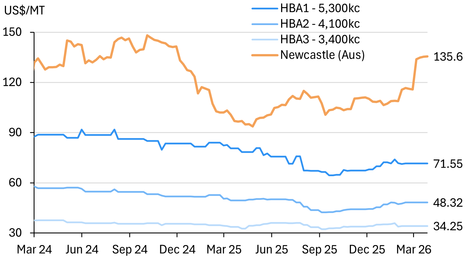 - Compared with the benchmark Newcastle coal benchmark (+25%), Indonesia’s HBA-priced benchmarks have been almost flat since the war broke out, especially for lower-grades.