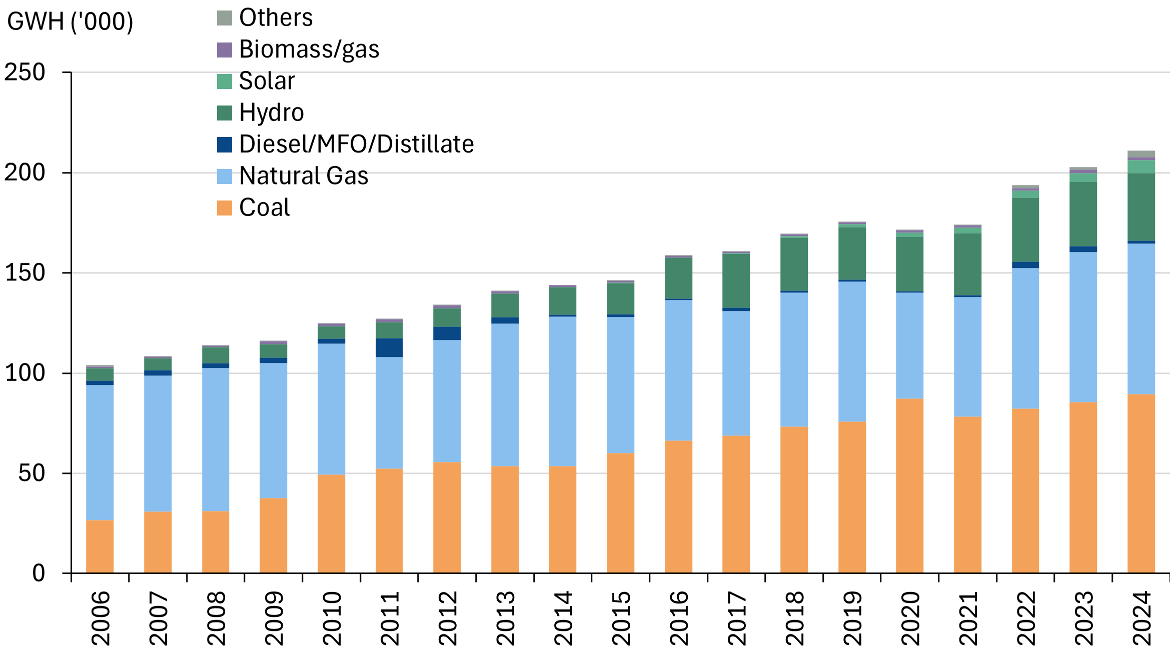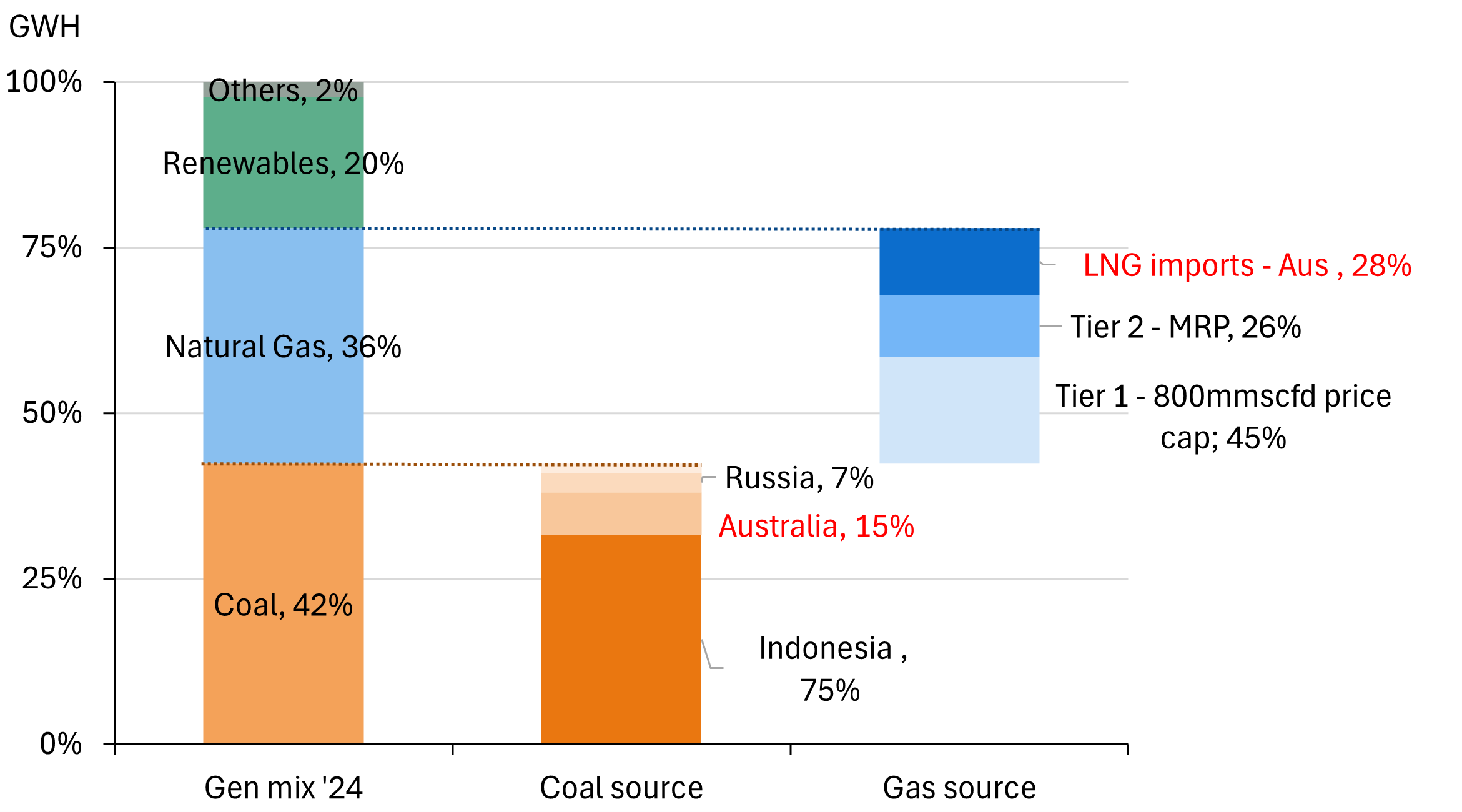 - Outside of coal, we estimate less than 10% of total generation mix comes from imported LNG, which in turn is primarily sourced from Australia, ensuring at least supply security if not pricing stability. Of course, the balance of the gas is sourced domestically with 800mmscfd under a price cap.