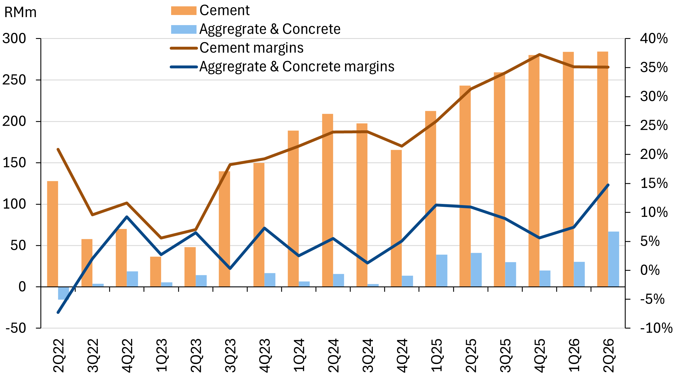 MCement’s 1HFY26 performance is on track to meet consensus’ high-growth assumptions, with revenue and NP at 48%/51% of forecasts. Furthermore, NP margins in 1H26 were at a historic high of 17.5% in 1HFY26.