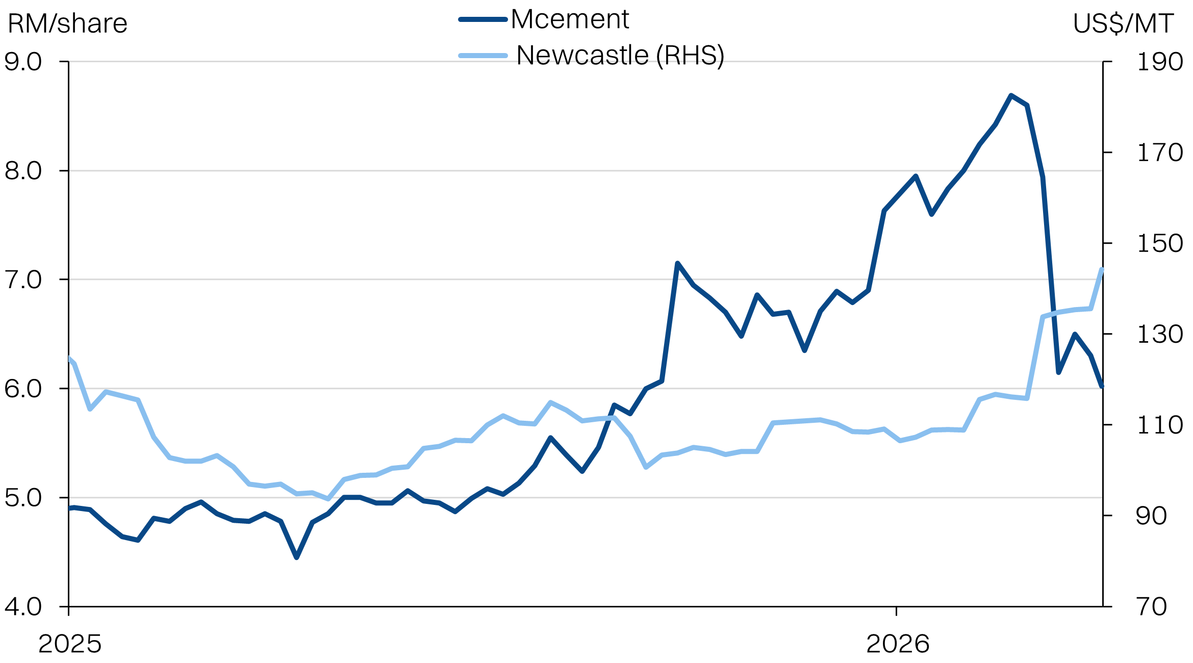 Against this backdrop, one of the big losers from the war has been the share price of Malayan Cement (MCement), down -30% peak to trough. We think a key catalyst for the sell-off has been fear of rising coal prices as well as softer demand. After all, coal makes up 40% of cement manufacturing costs.