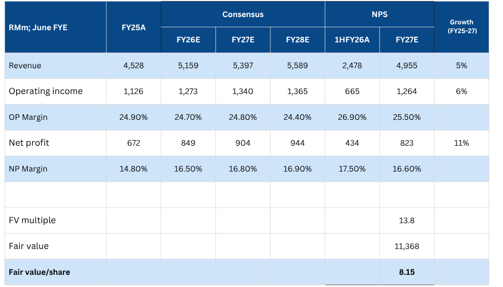 For our earnings assumptions, we have trimmed revenue growth to 5% CAGR for FY25-27E, or RM4.955bn. This is very reasonable considering 1HFY26 is already annualizing towards RM5bn. Additionally, we assume margins hold at 16.6% - marginally lower than consensus’ expectations of 16.8%. This leaves plenty of headroom to surprise on the upside.