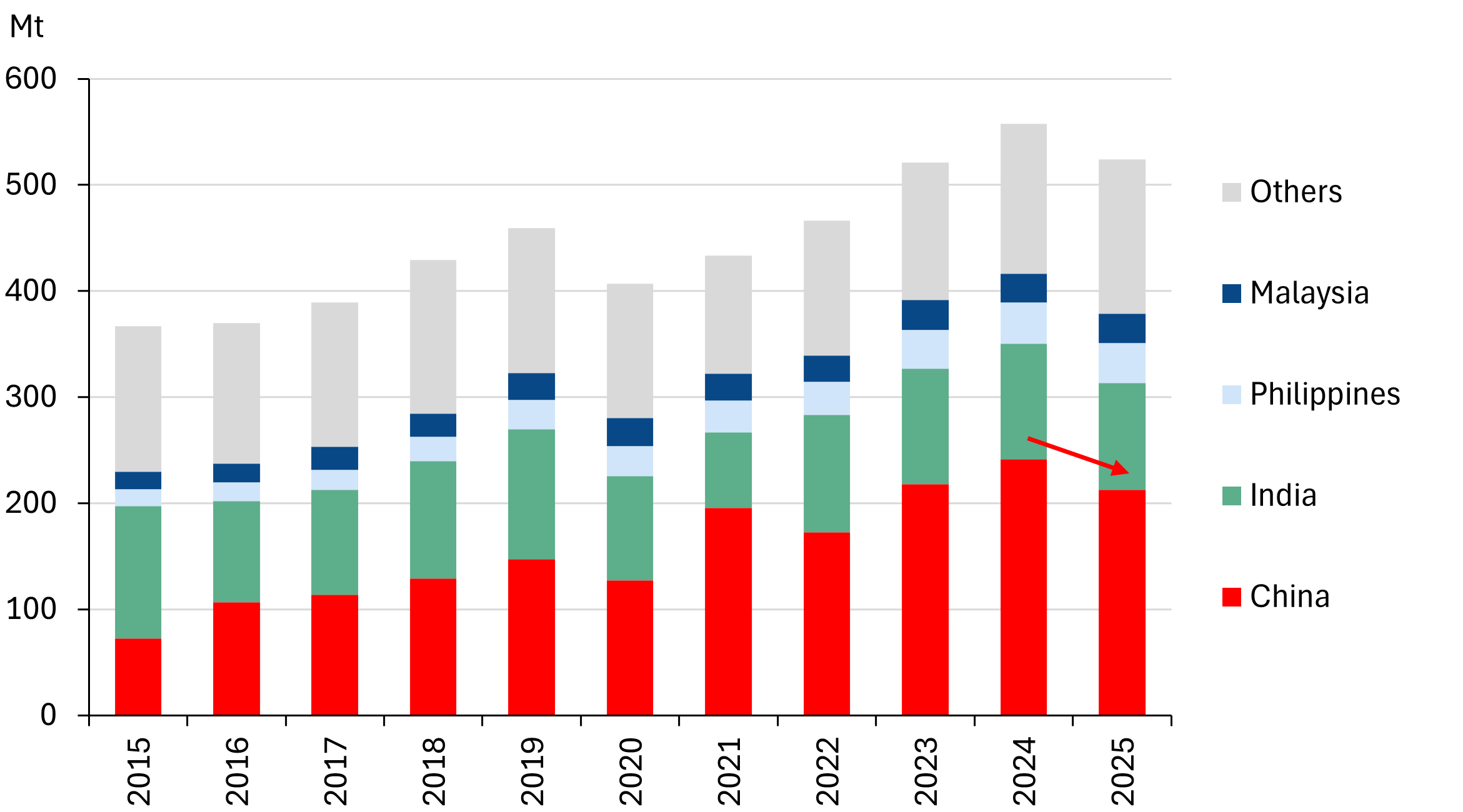 Against rising coal production, many of Indonesia’s main export destinations are pursuing long-term decarbonization roadmaps. China is the largest importer of Indonesian coal, making up 43% share in 2024, but falling to 40% in 2025. China’s imports of Indonesian coal fell by -12% YoY in 2025, driving an overall -6% YoY drop in Indonesia’s coal exports.