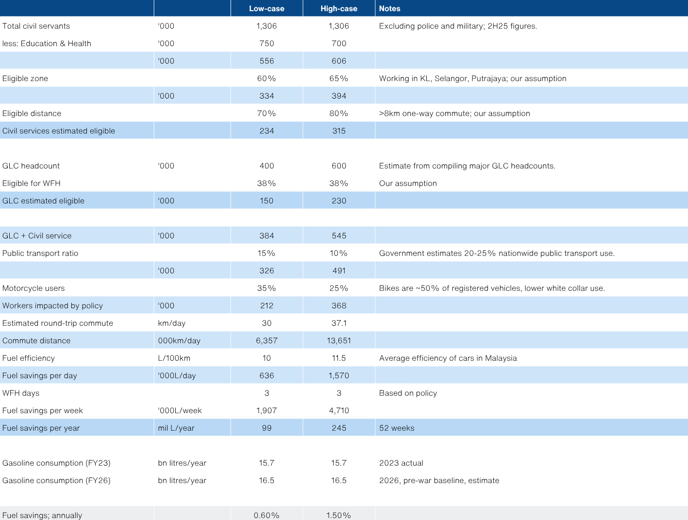 - We estimate the fuel savings from the work-from-home (WFH) policy is only 0.6% to 1.5% on an annualised basis. This is very small, implying at most an additional week of fuel reserves. However, this excludes potential compliance from the private sector as well as the impact of demand destruction from the higher prices on unsubsidized consumers (RON97 and diesel), the reduction of the Budi95 quota to 200L, and the hit to commercial demand.