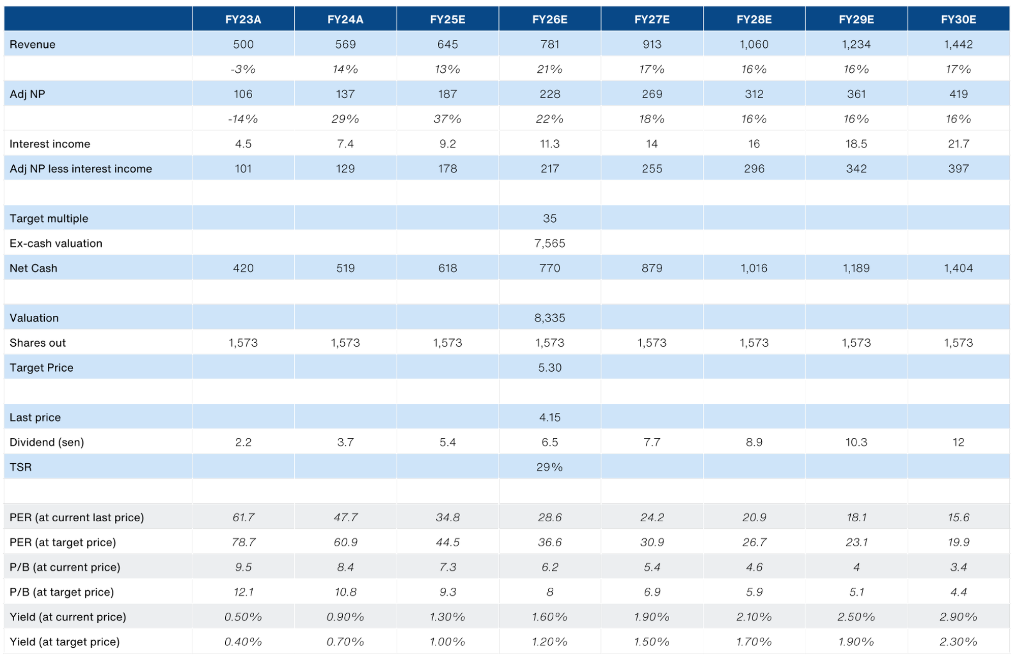 - We upgrade our target price to RM5.30 on a slightly lower target multiple of 35x FY26 PER. Maintain BUY.