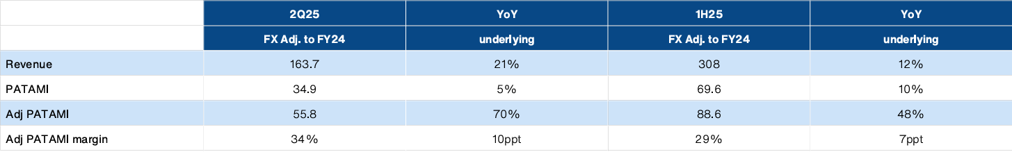 - Underlying revenue and PATAMI rose $+21\%/+70\%$ YoY, adjusting for one-offs and forex translation. Beat vs ours/street expectations.