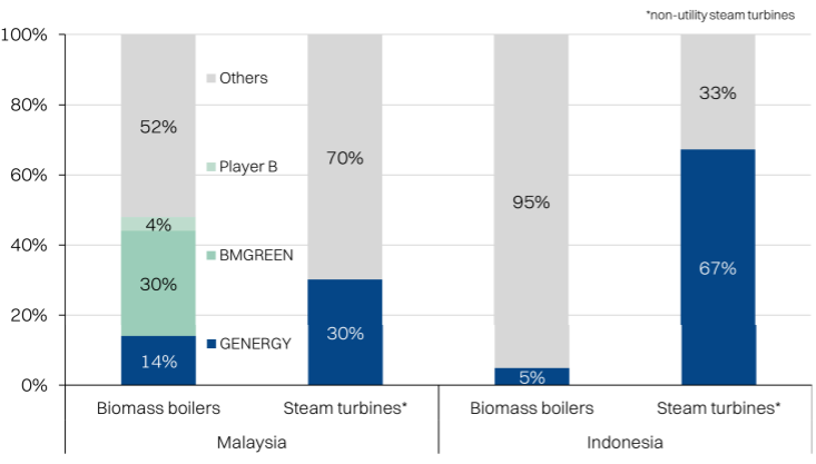 Wasco Greenergy Bhd (GENERGY) is one of the top biomass power equipment EPCC companies in Malaysia and Indonesia. This encompasses boilers that are fabricated in-house and the distribution of Shinko steam turbines. GENERGY differentiates itself from its direct competitor, BM Greentech, by providing engineering for customized solutions. It will further differentiate itself by venturing into asset ownership of biomass-to-steam systems for industrial customers.