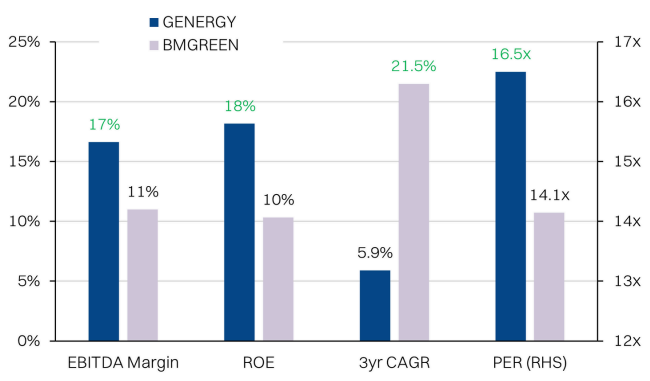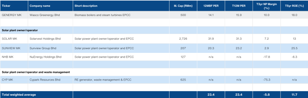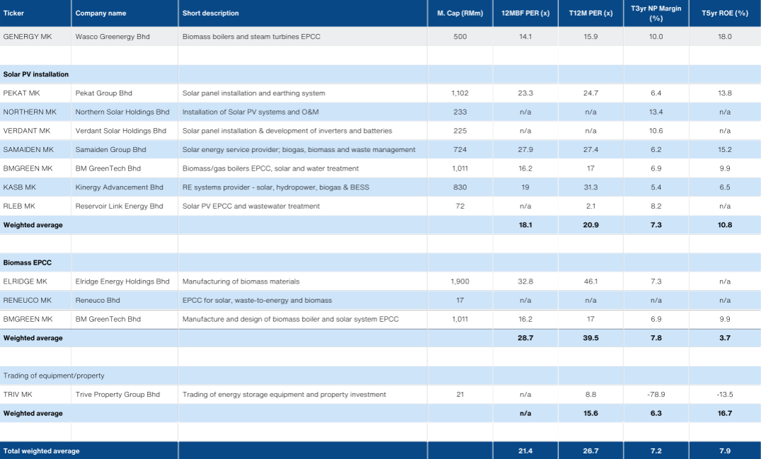 - The IPO price of RM1.00 implies a PER of 14x FY26E. This is a substantial discount to GENERGY’s direct comp, BM Greentech, which averaged 19.5x PER over the past 3 years. This looks cheap in our view, given GENERGY’s existing EPCC core business boasts 21% GP margin compared with BMGREEN’s 17% and 18% ROE against the latter’s 10%. The discount is largely the function of slower earnings growth: +5.9% 3yr NP CAGR (FY26E) compared with BMGREEN’s +21.5% (FY27E, ended-March).