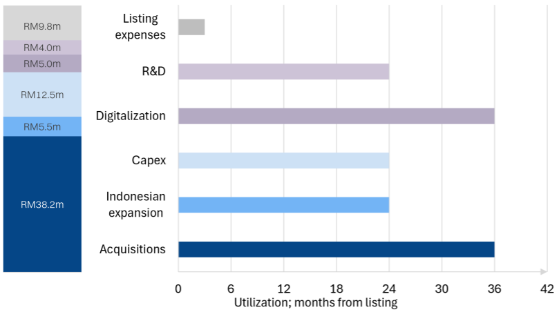 Listing expenses (13%): RM9.8m has been allocated for listing expenses, which is relatively high against the mid-single digit benchmark.