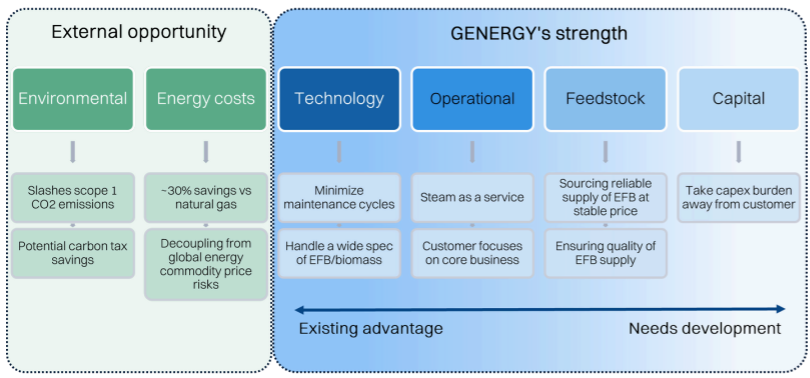 There has been a sizable latent potential in biomass power that has been under-exploited in Malaysia and Indonesia. But this is changing. Between long-term pressures to decarbonize and the elevated price of natural gas post-liberalization, many industrial users will be looking for cheaper and more sustainable alternatives. Biomass-powered steam can solve this problem and GENERGY well positioned to capitalize on this opportunity via an all-in build, own and operate model.