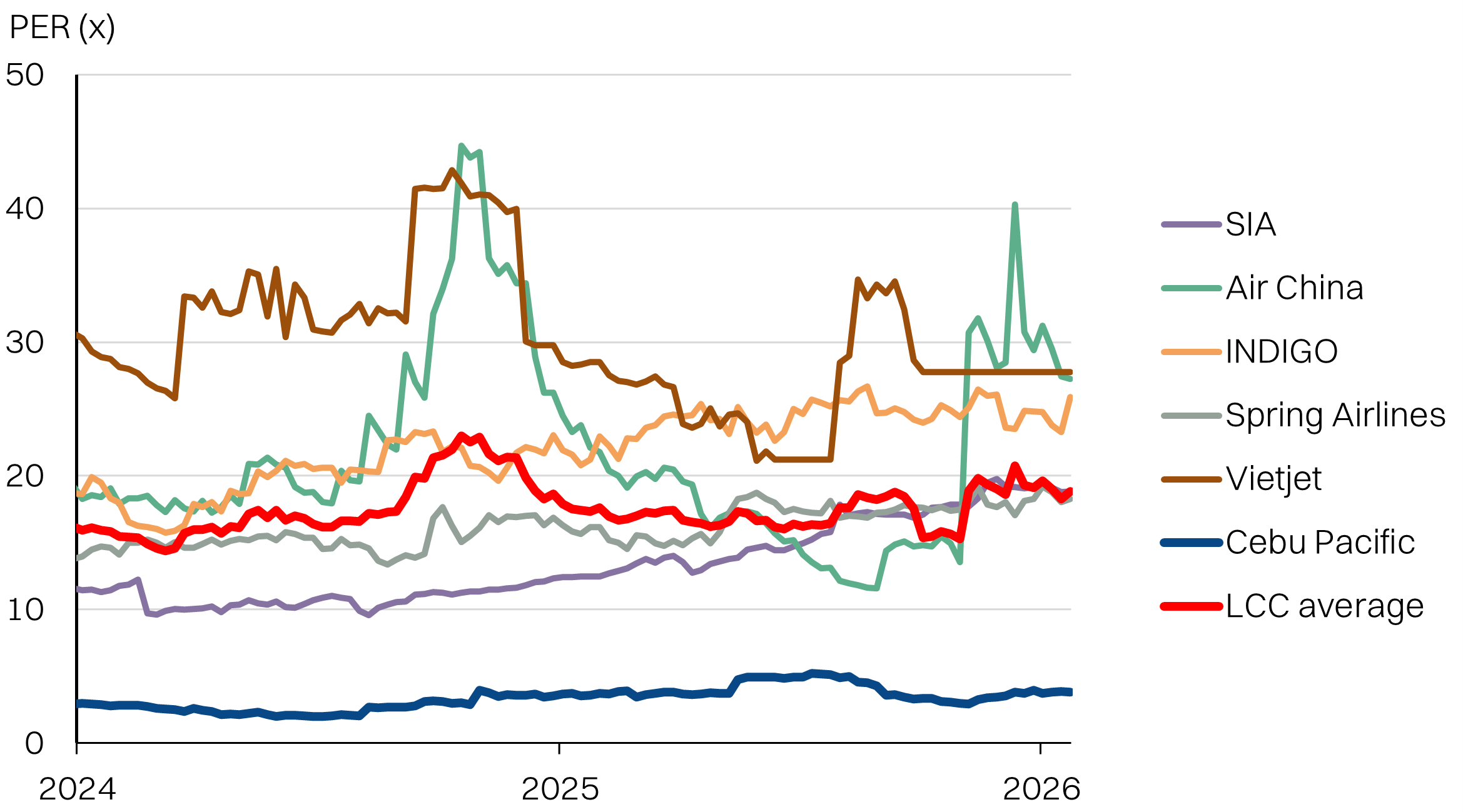 Against the post-pandemic average EV/EBITDA average for LCC’s of 7.2x, we think the -1SD of 6.5x is a fair benchmark for AAX given the highly-leveraged balance sheet. At an EV/EBITDA of 6.5x FY26E EBITDA of RM4.6bn, the implied fair value for AAX is RM3.15. It also implies a PER of 15x FY26E which is also around -1SD vs the same peer comp PER average (but including Vietjet).