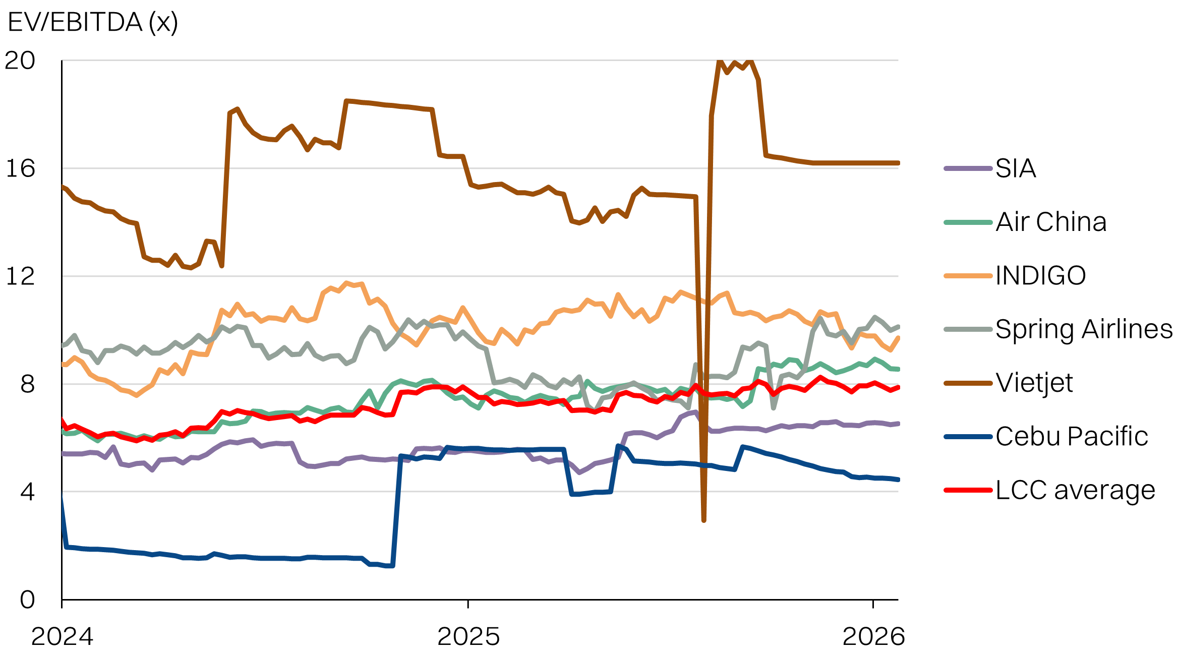 Since Capital A and AAX historic valuations do not represent well its current balance sheet and outlook, we think using regional peers as a valuation benchmark might make sense. Airlines mostly trade at around 4-12x EV/EBITDA, with the LCC’s average at 8x. Note, we have excluded Vietjet as it was a significant outlier.