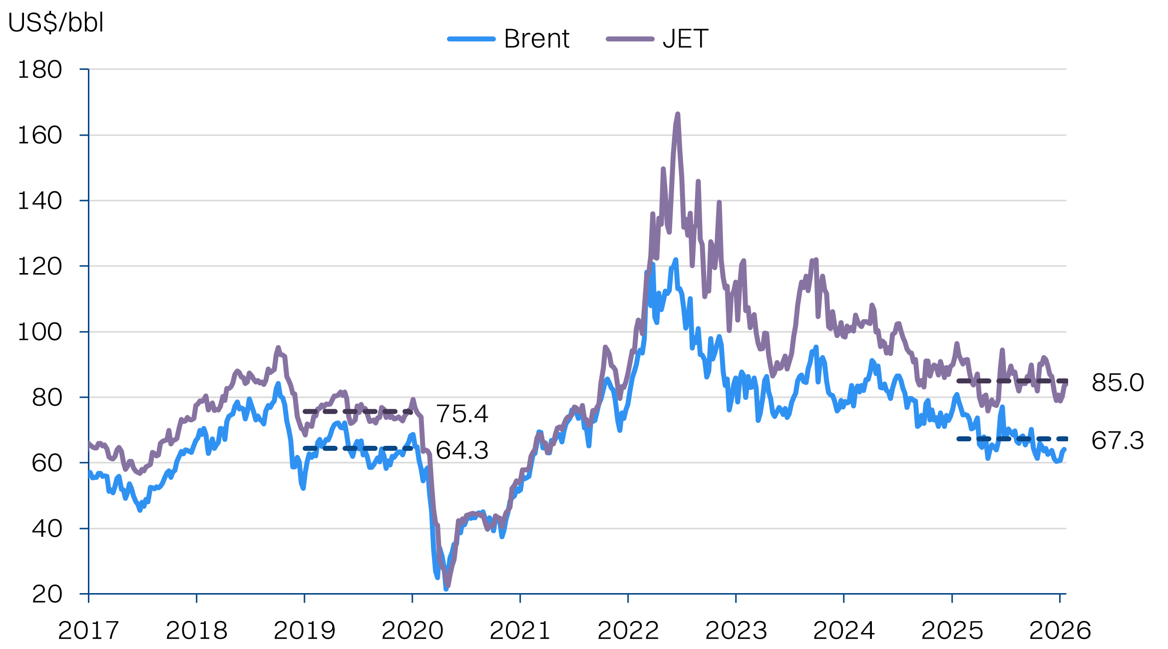 Brent has fallen -21% in the past one year, JET is down -9%