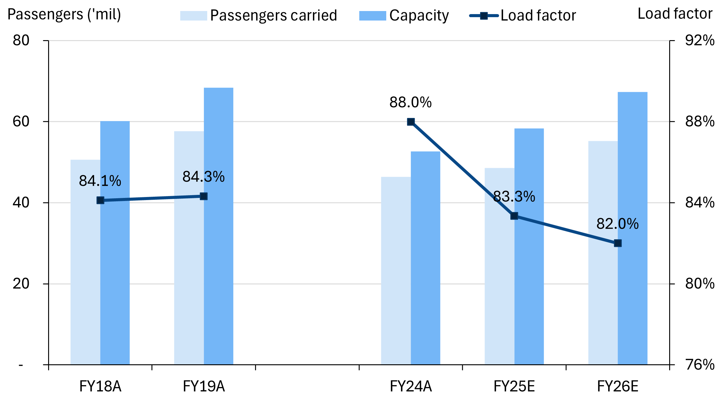 - Fares - We anticipate this will come at the expense of lower yields (average revenue per passenger), as additional supply will need to be supported by promotional activity. Keep in mind that AirAsia has been operating at relatively high load factors (89%/84% in FY24A/25E) on constrained capacity. However, given the previously idle aircraft still carry leasing overheads, the net impact of reactivation should be profit accretive.