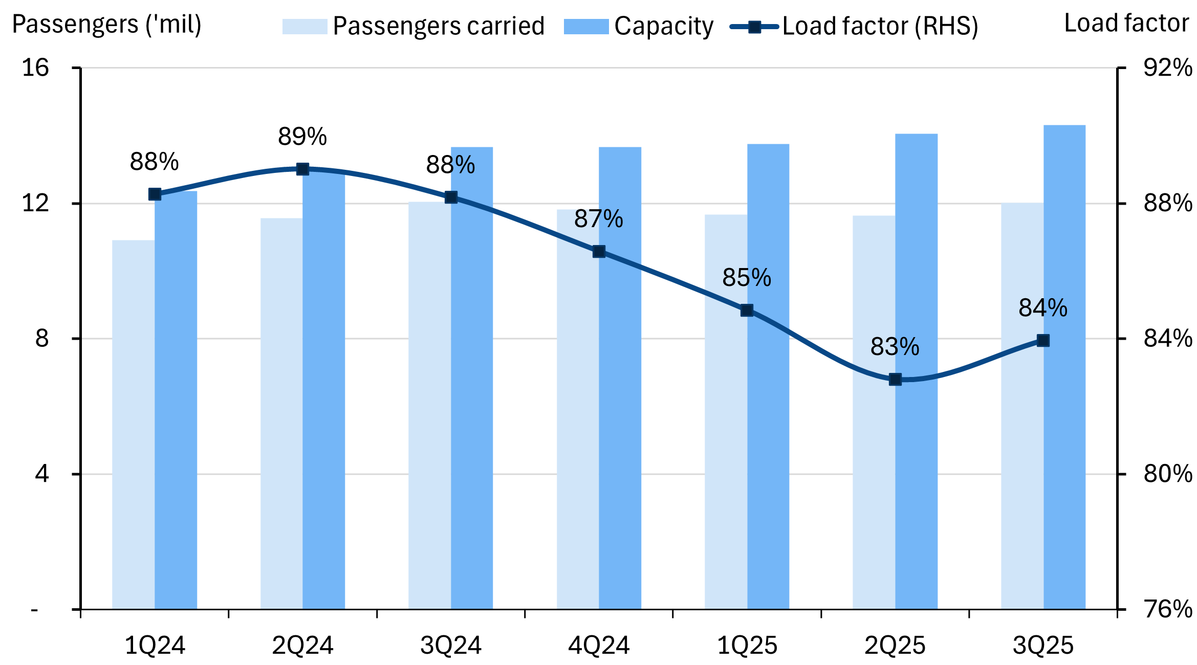 Looking ahead, there are some signs of recovery, coming from a low base. Load factors (ex-TAA) are already improving in 3Q25 to 84% after a four quarter slide as AAX continued to add capacity. The stronger ringgit should be supportive of outbound tourism from Malaysia, where AAX will be adding the most capacity. Overall, the resilient demand should help absorb some of AAX’s incoming supply.