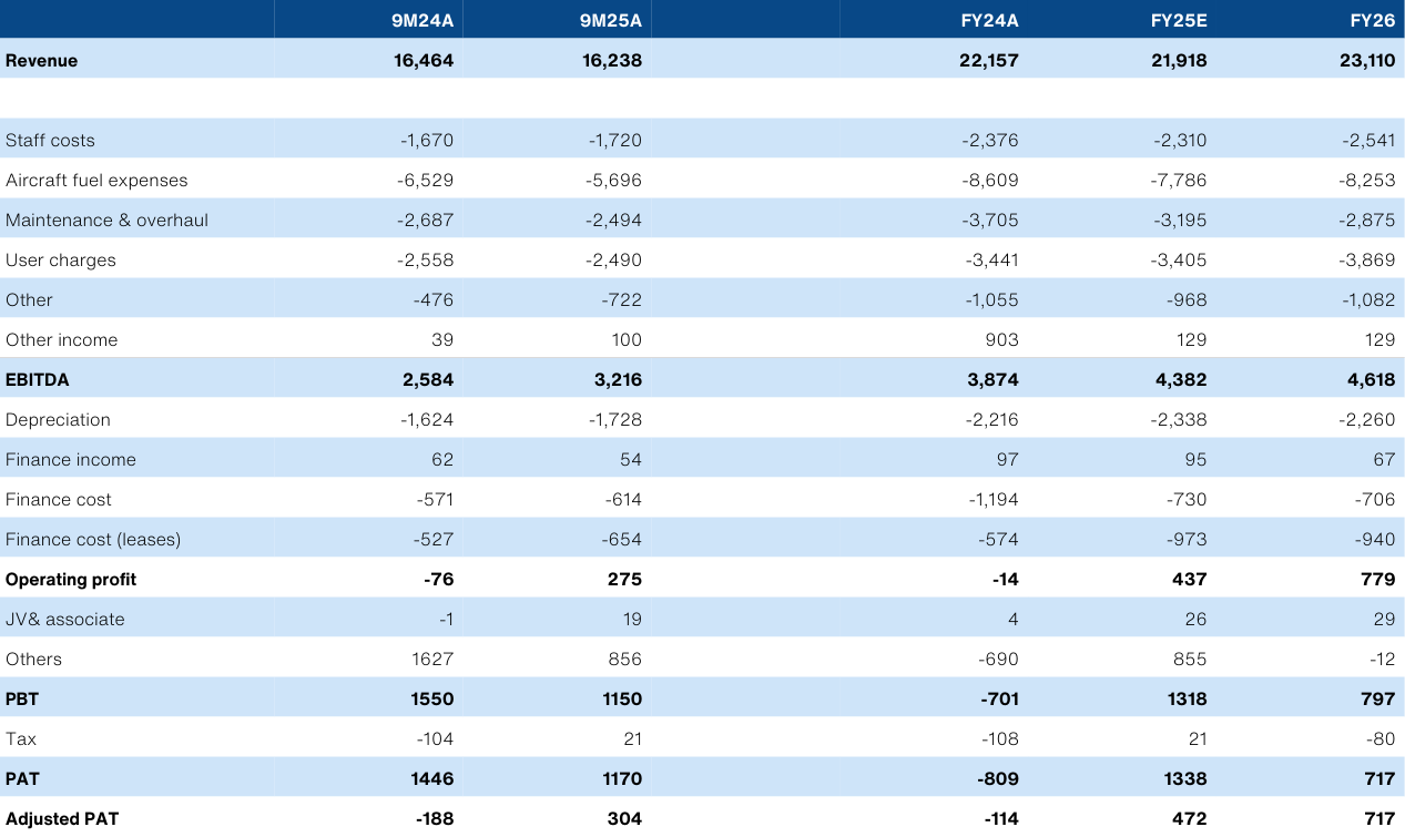 AAX will be returning its full fleet into action by 2Q26, adding ~15% more capacity. Keep in mind that AirAsia has been carrying the leasing cost of the grounded aircraft. While we anticipate some pressure on yields, we expect this will easily drive +5% topline and EBITDA growth. In turn, this translates to +52% Adj. PAT growth, given the improving operating leverage.