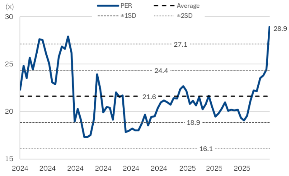 Our primary valuation methodology is PER - applying a 46.5x target multiple on FY26E earnings. This is well above the historical average PER of 21.6x. However, we flag that the earnings potential from LCE is not front loaded to FY26. Thus, while FY26 multiples look stretched at face value, we forecast multiples easing to a more digestible 33x/26x for FY27/28E.
