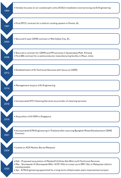 KJTS was originally the Asean arm of Dalkia Group, prior to a management buyout in 2014 by Lee Kok Choon and Sheldon Wee - both currently the key management and controlling shareholders (combined).