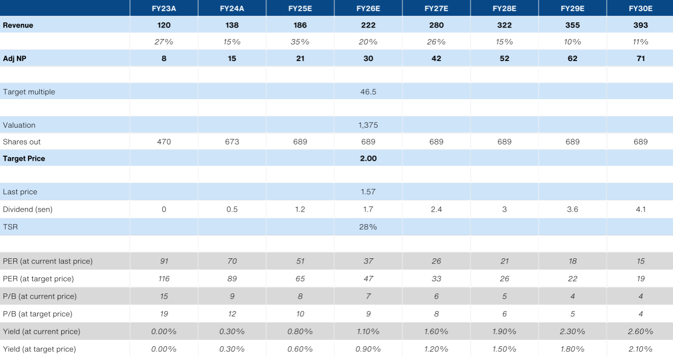 - Initiate with a Trading Buy and target price of RM2.00 on a FY26E PER of 46.5x. While steep, this is due to the deferred nature of earnings delivery. FY27/28E implied PER is 33x/26x at our target price. At the very least, this is a stock to accumulate on any pull-back from the recent highs.