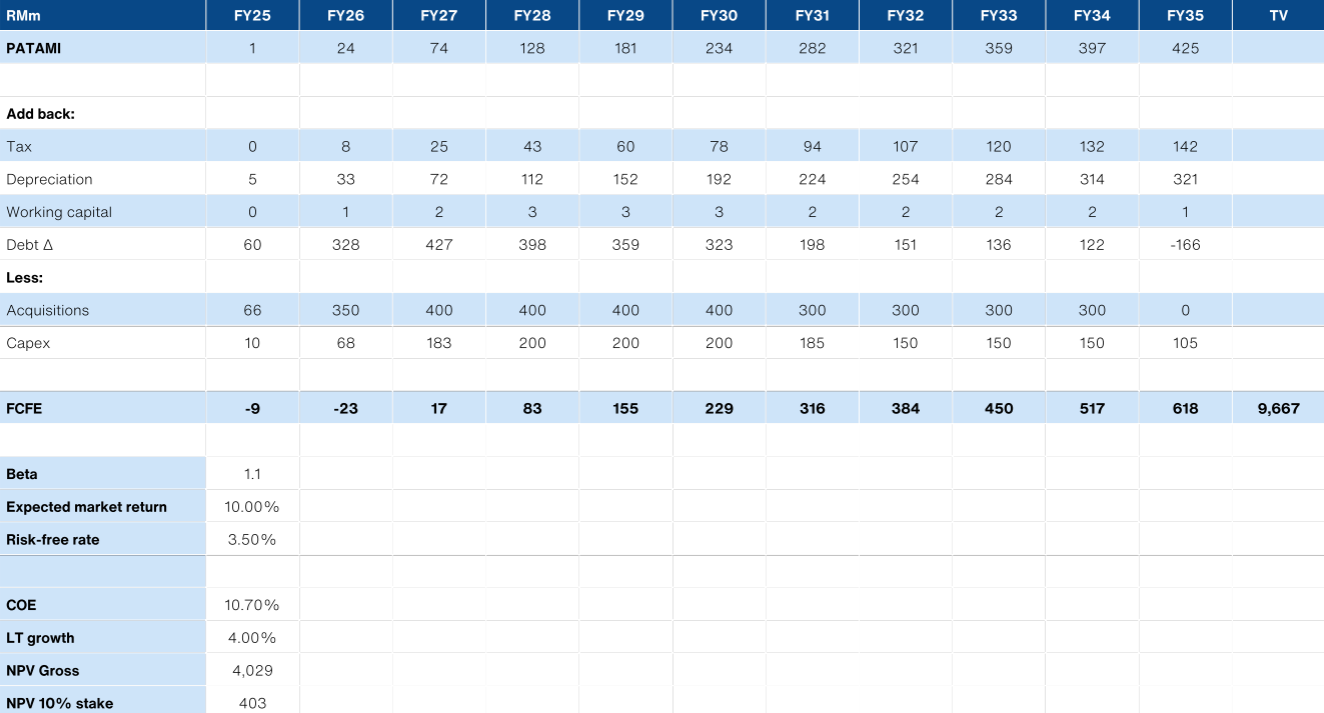 We also ran a secondary valuation on LCE. We assumed roughly RM1.5bn in total acquisitions and capex by FY28. Post-FY28, we assumed an expansion in fund size above RM 1.5bn, with continued acquisitions/capex totaling RM300-400m/per year till FY35 for our DCF stage 1.