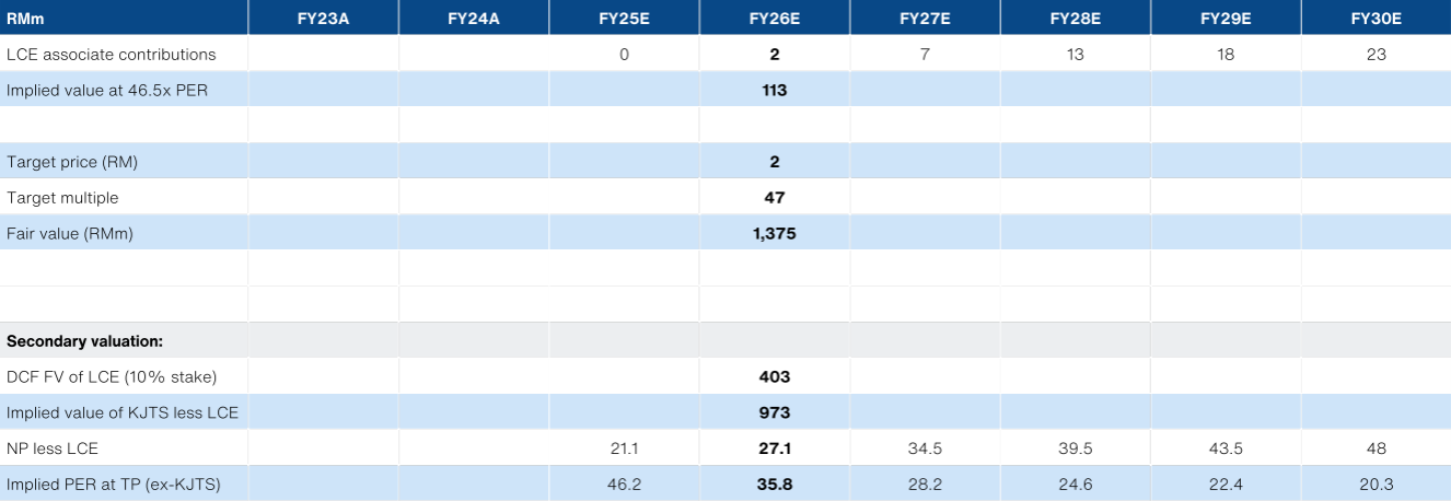 multiple to the associate earnings contribution from LCE (RM2.4m for FY26) - it only values the joint venture at RM113m.
