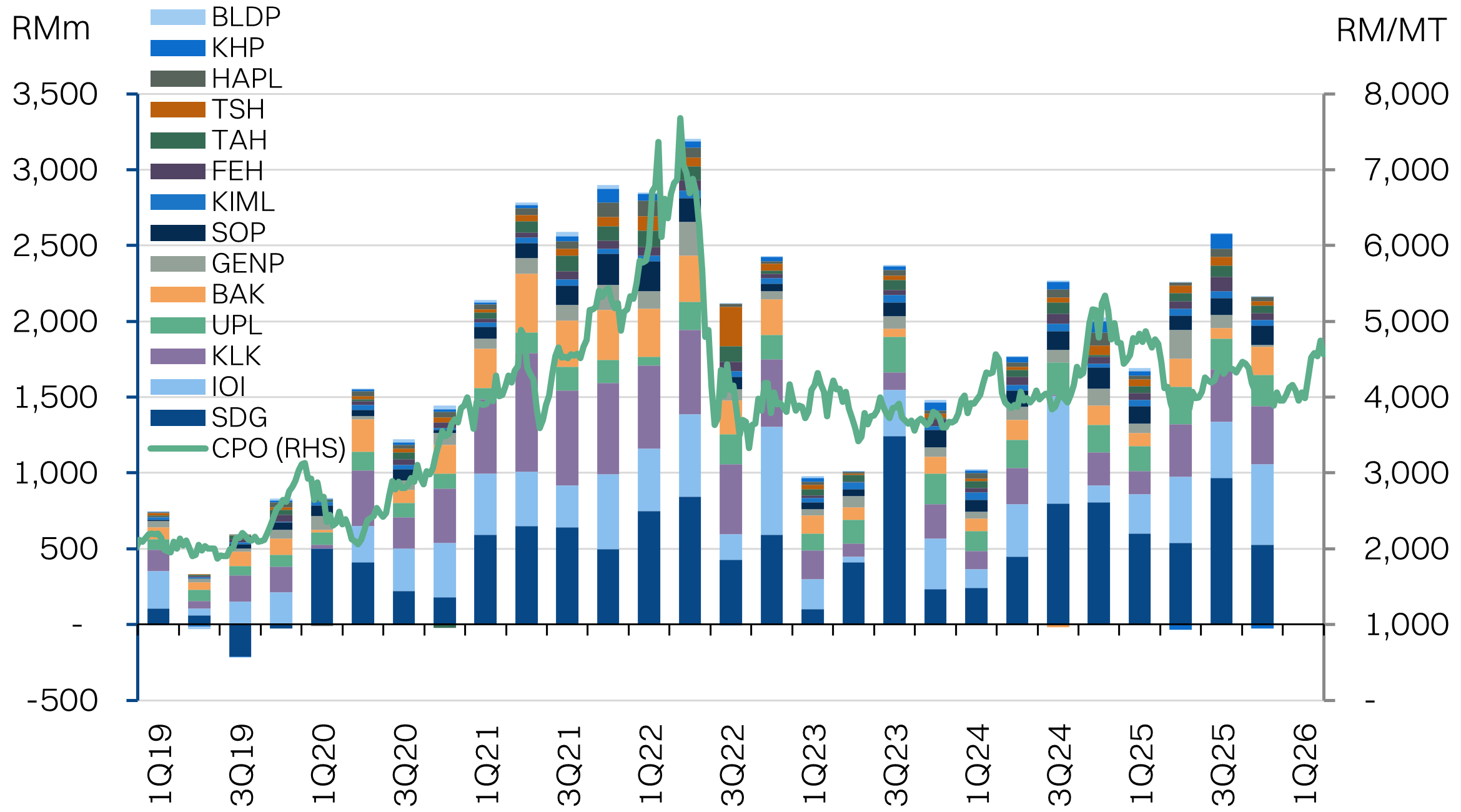 - We anticipate CPO stabilising at ~RM4,500/MT with downside risk, especially if Iran war continues the deescalation bias.