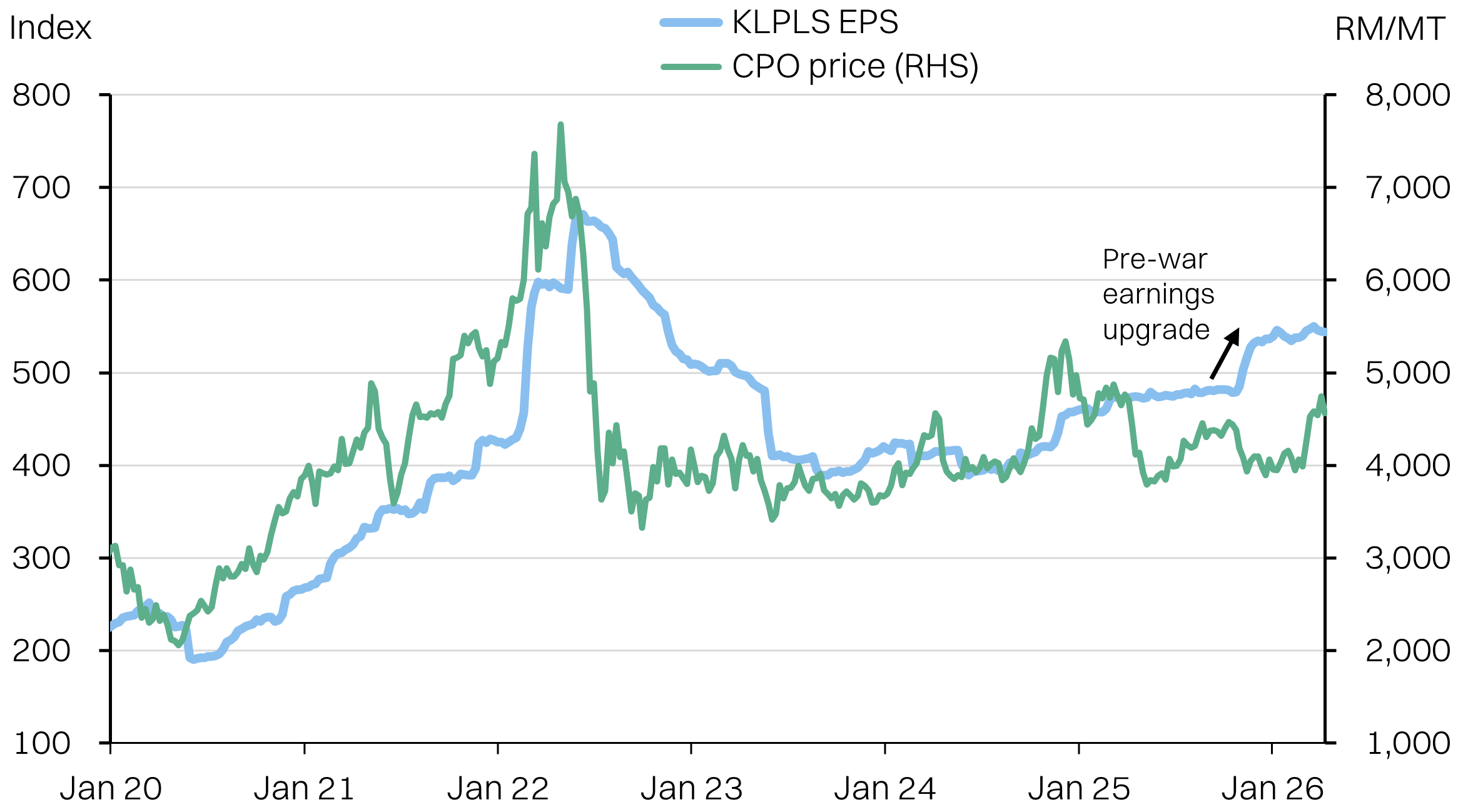 The other consideration when looking at valuations is the relatively slow adjustments to consensus expectations. Unlike the pre-2023, where sectoral earnings expectations closely-tracked CPO prices, the war has not actually driven an upgrade, yet.