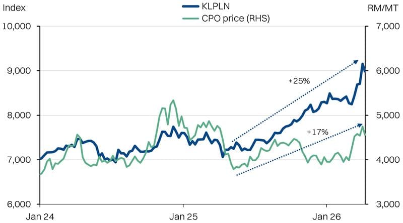 Yet, it has been plantation stocks that have been the bigger beneficiary. Against a +17% surge in CPO prices from the trough in May 2025, the KL Plantations index is up +25%.