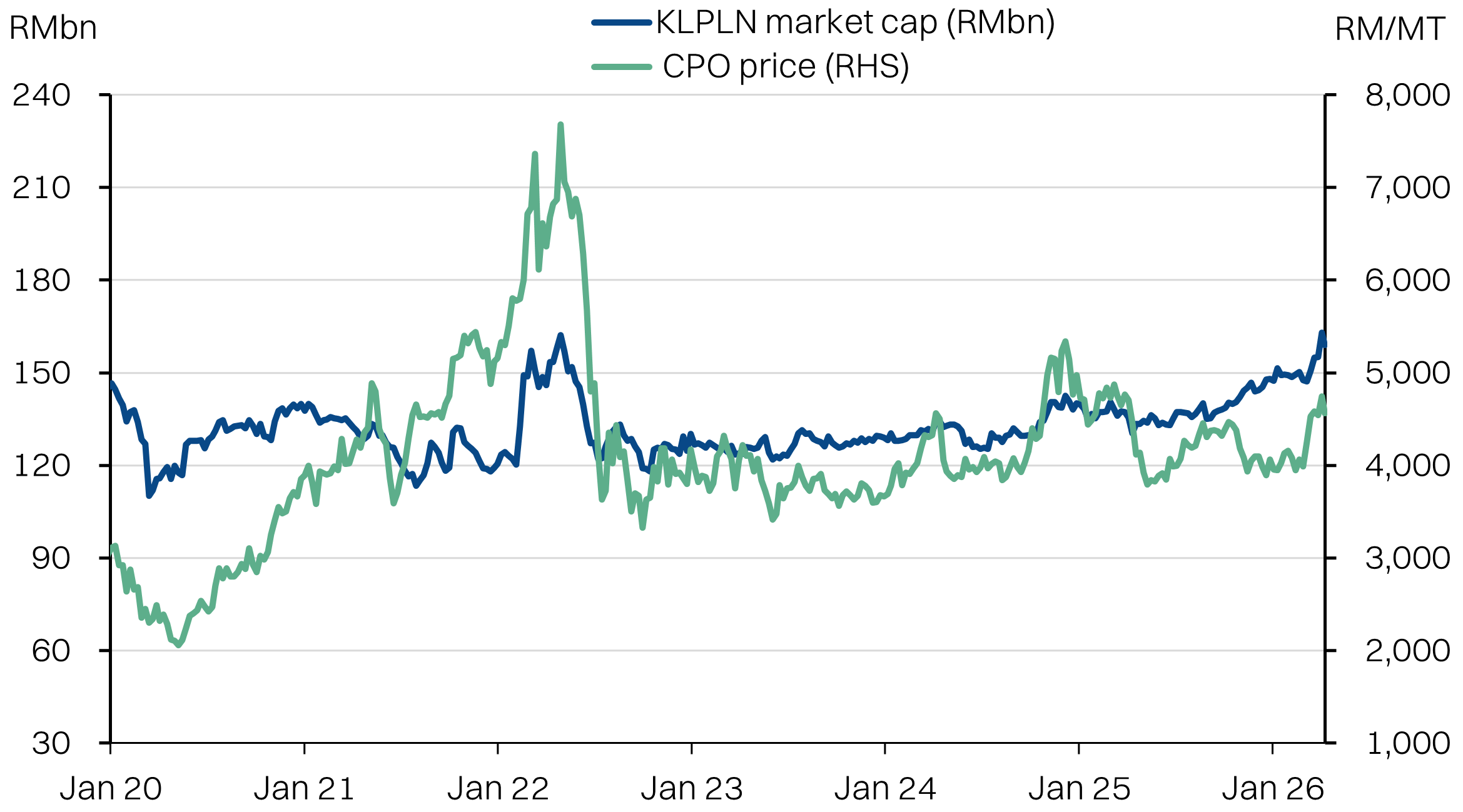 Indonesian government policy has been a recurring negative surprise for the industry since 2025, with the massive land seizures. Not only are planters without exposure shielded from the seizures, they can also benefit if Agrinas (Indonesia’s state-owned manager of the seized plantations) is not able to properly manage the massive 1.7m hectares it has suddenly ingested since 2025. Lower yields by Agrinas would tighten balances for CPO, but the exact impact of this is difficult to predict. Anecdotally, Agrinas has pulled in the pre-existing landowners to help run some of the seized estates.