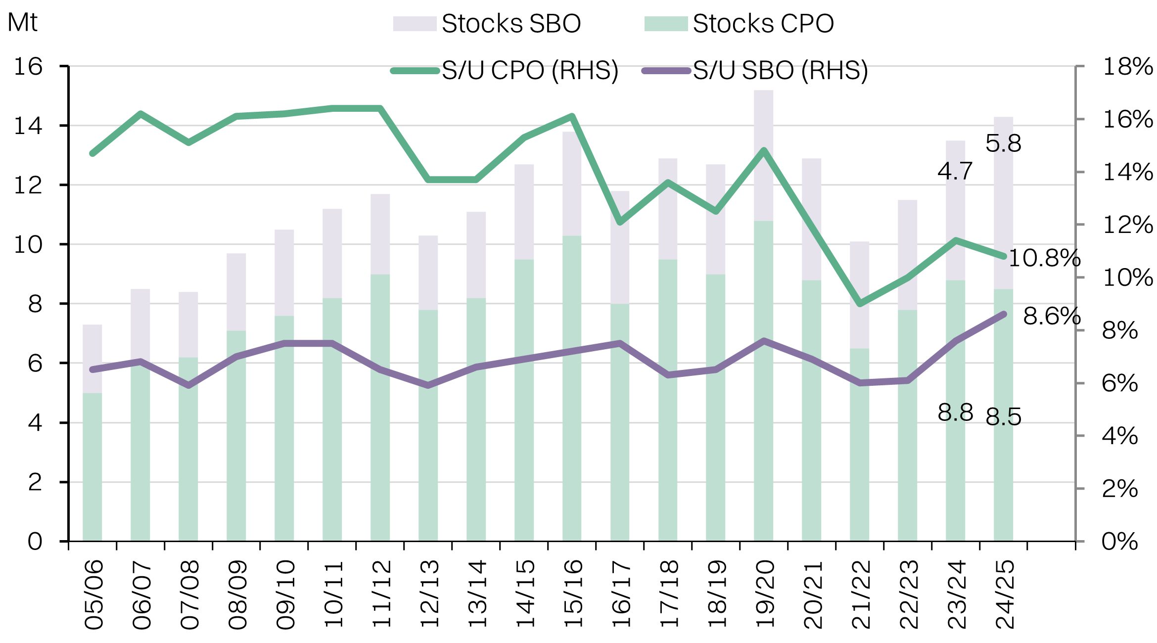 At the same time, CPO production is also poised for another solid year on the back of 2025's record high 20Mt. Improved labor availability, maturing estates and normalization of fertiliser application have supported average yields of 17.8MT/ha. We anticipate that stock-to-use ratios are at risk of rising in the next 3-6 months, driven by the potential methanol bottleneck for biodiesel in Indonesia.