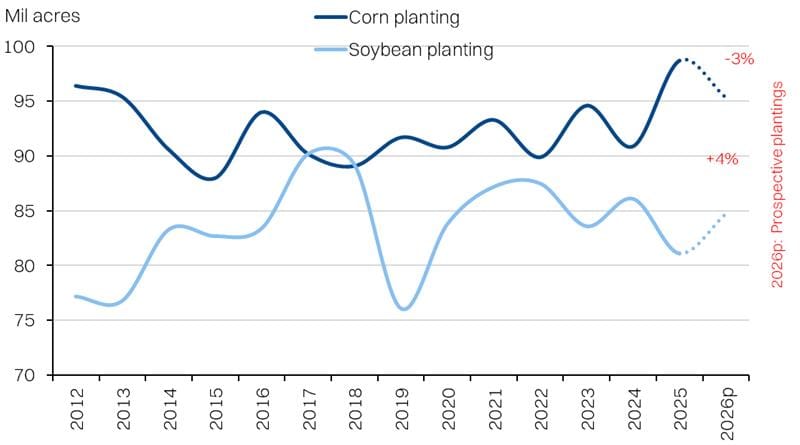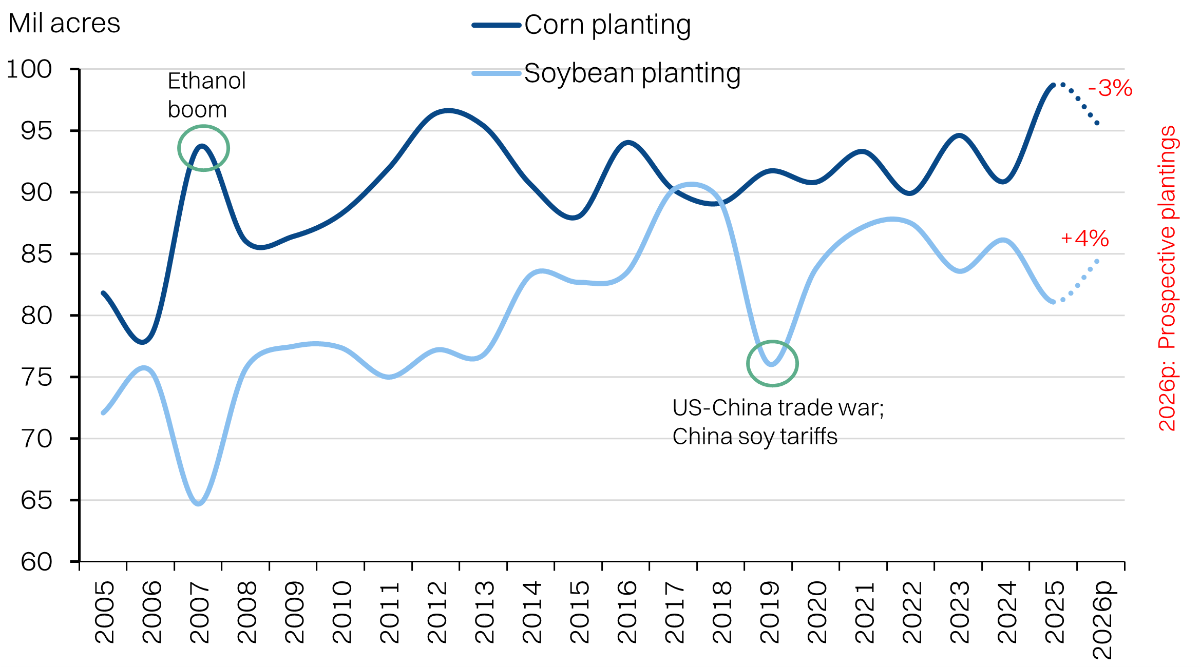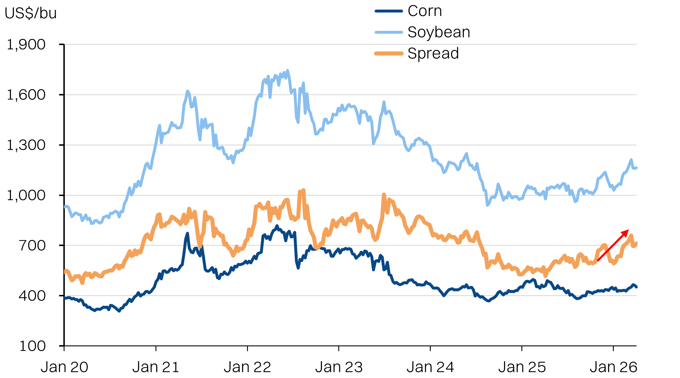 To be clear, we think the sector is still due for a windfall year on the elevated CPO prices. However, we cover a few potential speedbumps that could lower the ceiling for the sector, arising from the Iran war: corn-to-soybean substitution planting and methanol shortages in Indonesia.