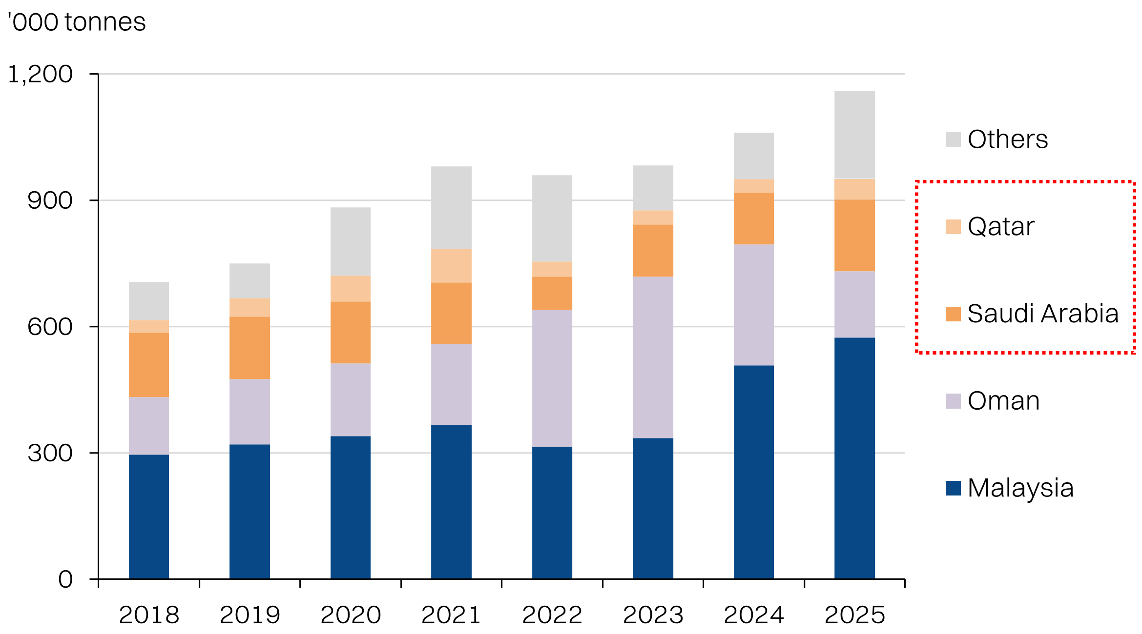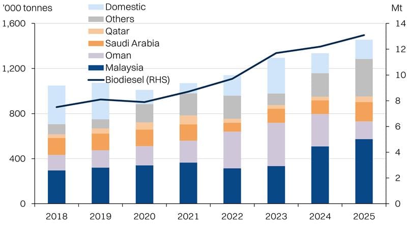 However, methanol is a key input in the biodiesel production process - transesterification. Roughly 90-100kg of methanol is needed per ton of biodiesel. Critically, Indonesia relies on imports for more than 80% of its methanol requirements, of which at least 19% of supplies have been disrupted by the closure of the Strait of Hormuz. Additionally, another 16.5% comes from Oman, which is not yet disrupted but at risk from missile/drone attacks.