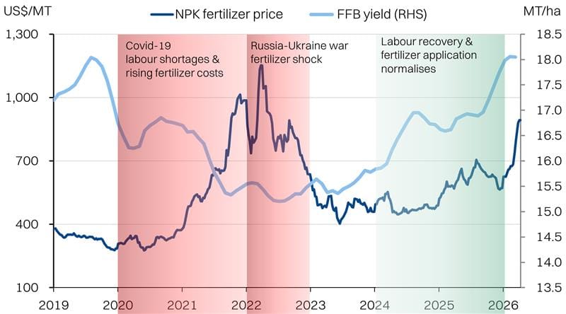 However, productivity can take a hit. A combination of labour shortages and high fertiliser prices saw fresh fruit bunch yields tumble from 2020-2022. Recovery began in 2023 with labour supply improving, but it took >12 months for the improved fertiliser application to lift yields back to pre-pandemic in late 2025.