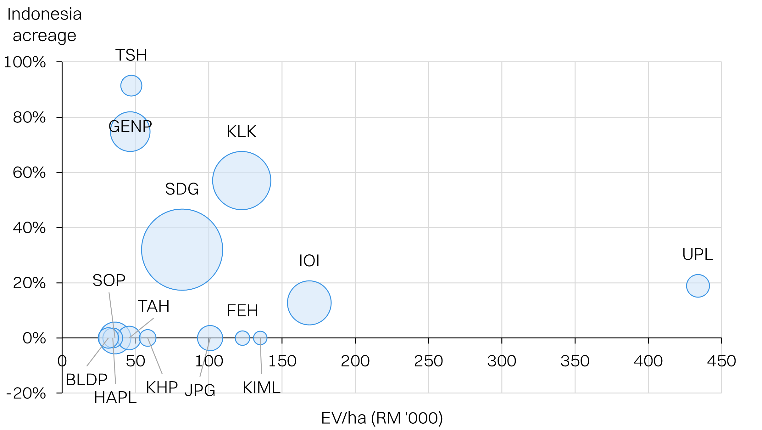 - Among the big caps, we’d be splitting hairs, but we prefer IOI on the margin for its lower Indonesia exposure since the other metrics are fairly similar compared with SDG and KLK.
