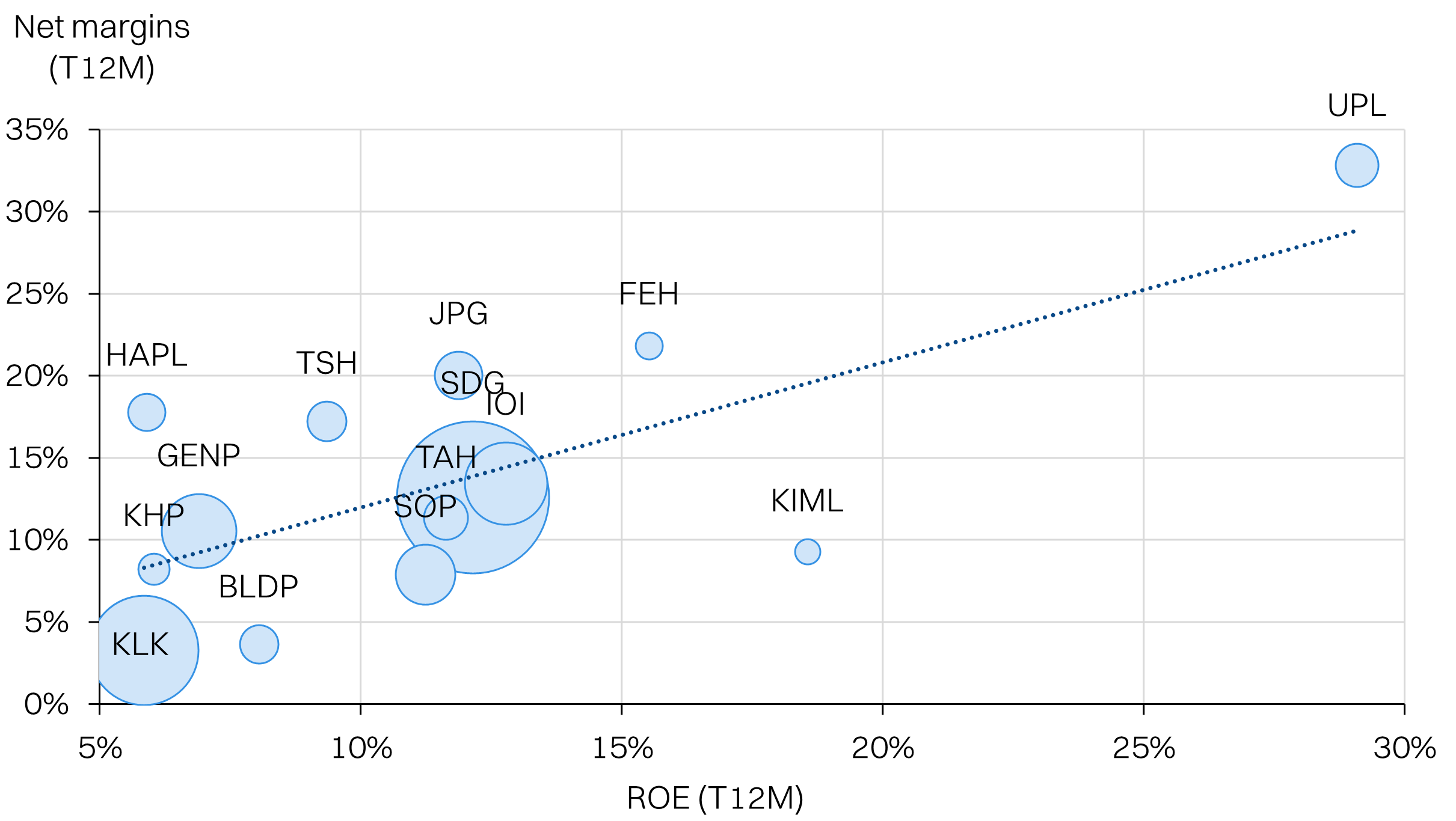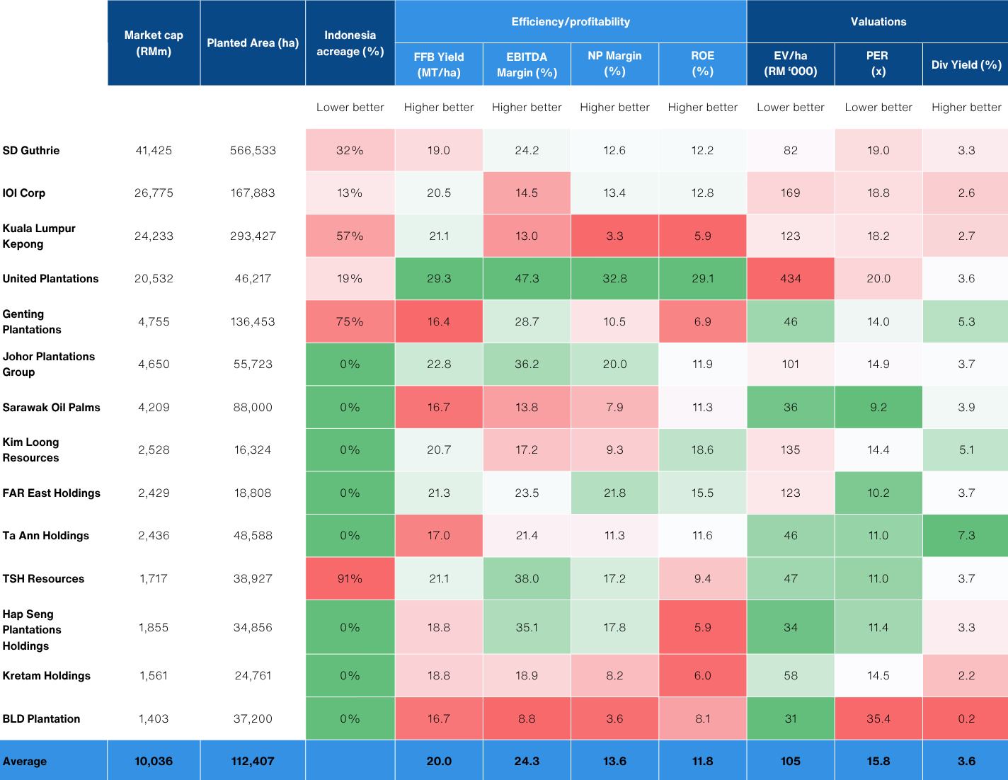 We are spoilt for choice within the plantations sector. For this report, we focused on the top 14 by market cap. Broadly, we like planters with lower valuations, high yields, high margins, and low exposure to Indonesia.