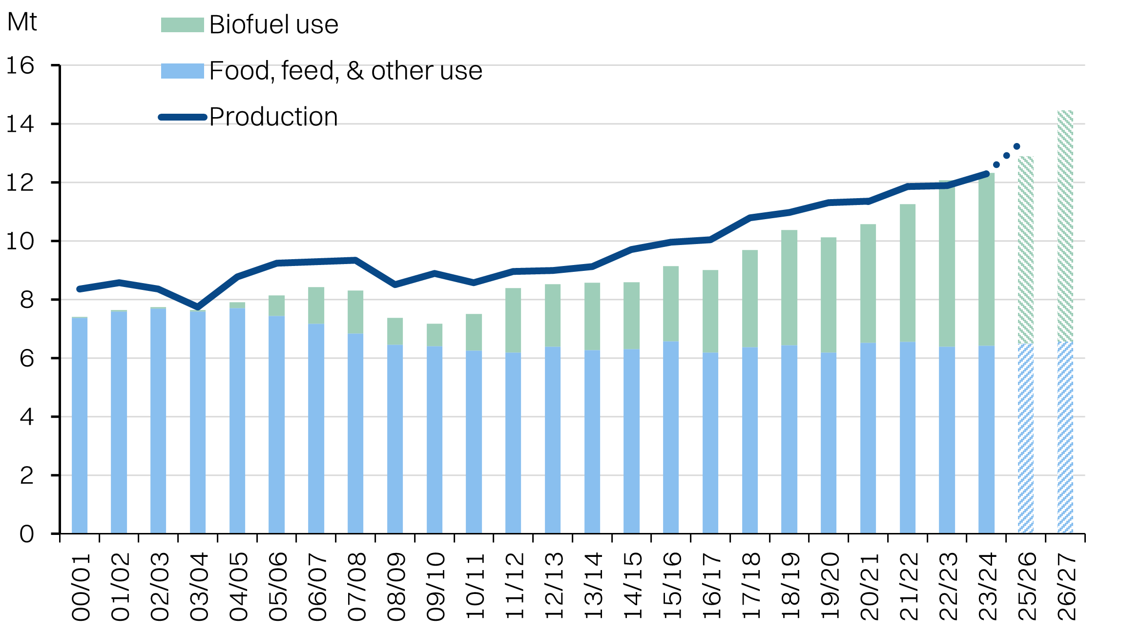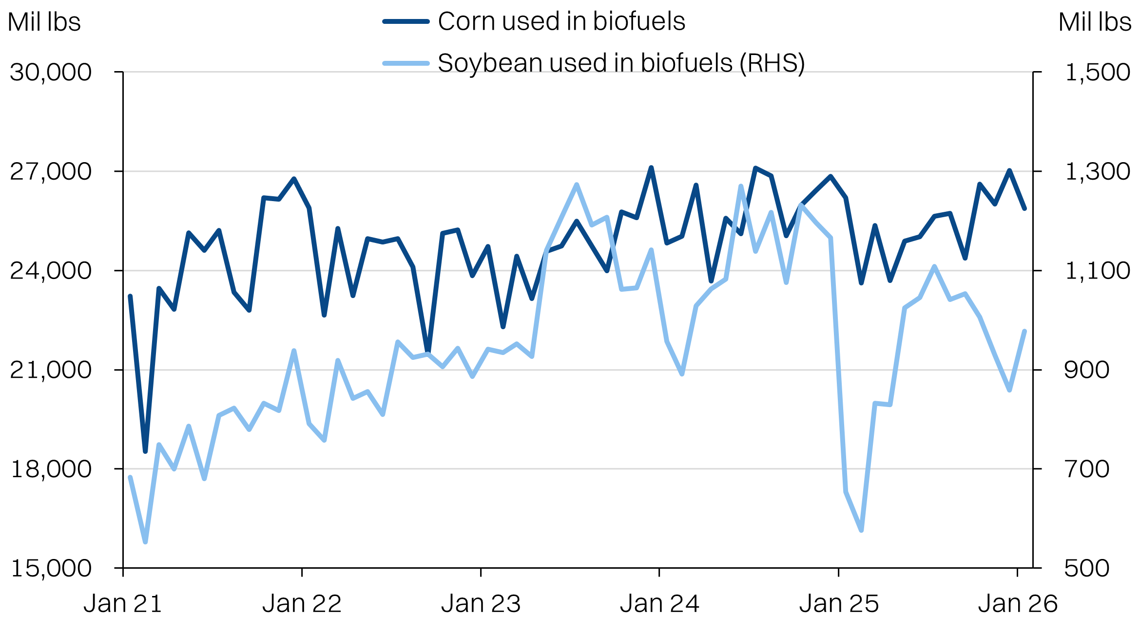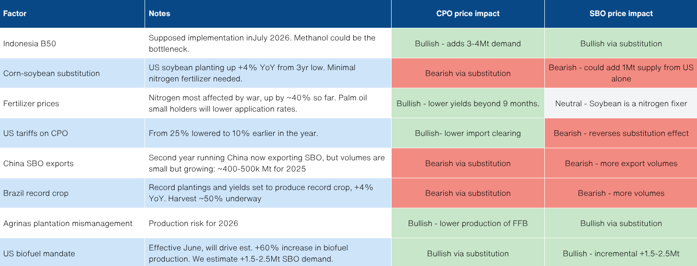 Against biomass-based diesel demand (BBD) of 5.4/5.7bn gal (26/27), estimated SBO requirement at current feedstock share would be 6.4/7.9Mt. This is high. But marks a +8%/+34% increase from 2025's estimated demand of 5.9Mt. From a pricing perspective however, the demand is tail loaded to 2H26, due to the timing of policy implementation (June).
