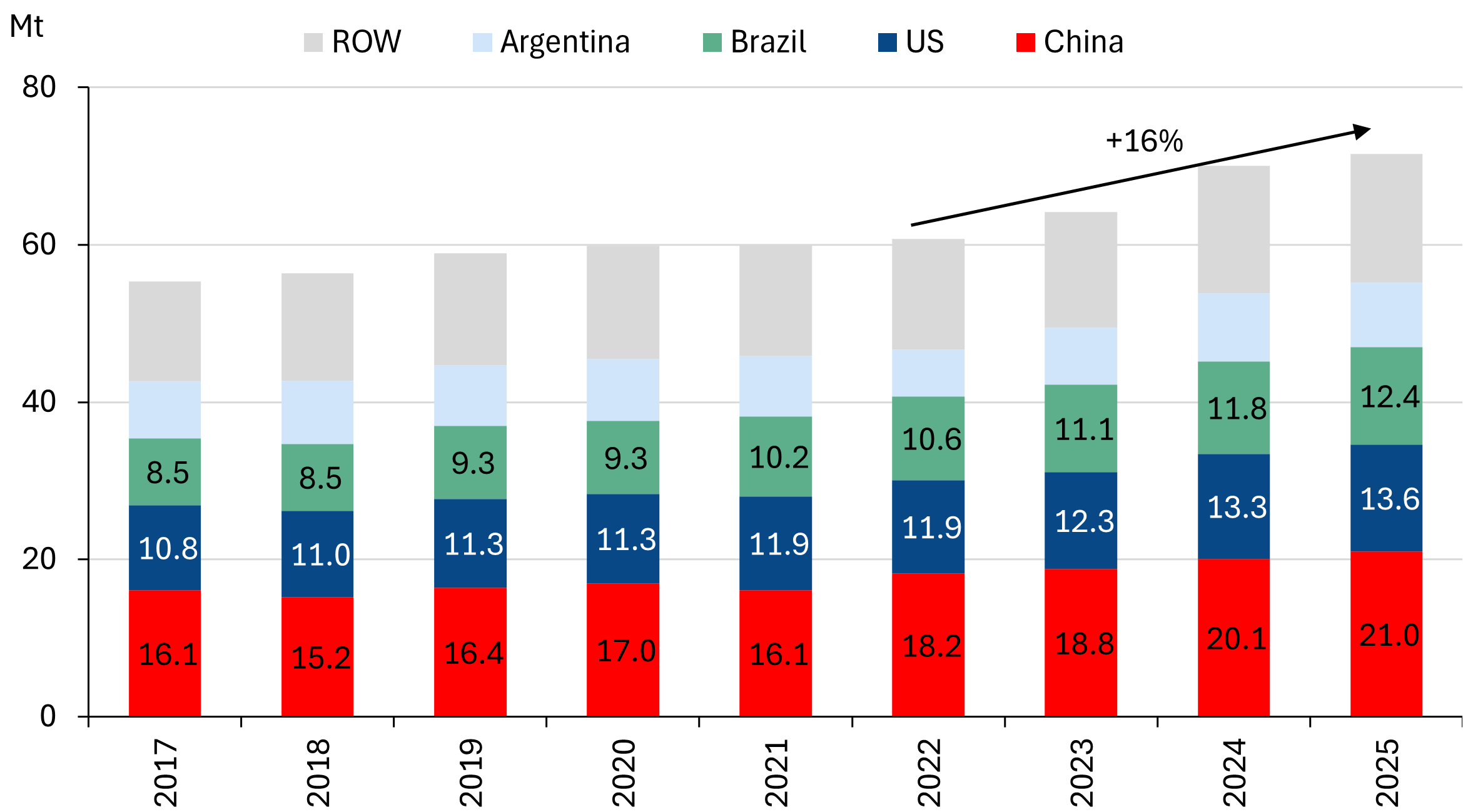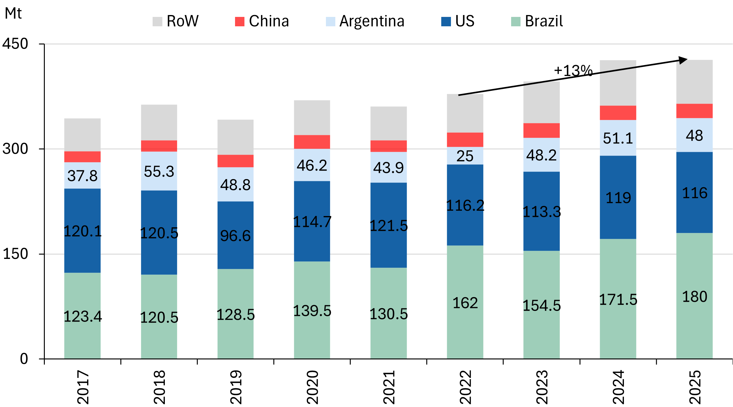 Against this backdrop, the USDA is forecasting (link) US crushing will rise to a record 2.58bn (+5.5% from previous forecast) bushels this year, which will translate to 13.5-13.6Mt of SBO based in the trailing extraction rate (also record highs) of 11.55-11.60lbs/bu. This points to a +10% YoY increase in SBO production for 2026E.