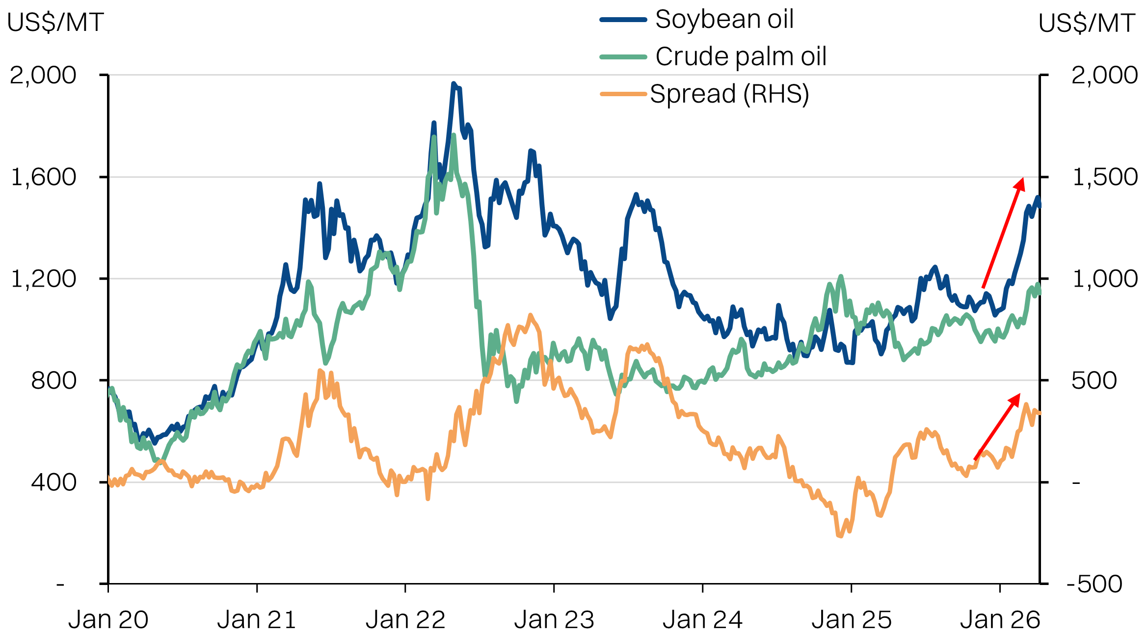 A key policy objective of the biodiesel mandate is to lower reliance on oil imports and manage diesel prices onshore. It could also cushion the pressure on the trade deficit. Indonesia’s biodiesel program is funded by the export levy on palm oil under the Palm Oil Plantation Fund Management Agency (BPDPKS), which compensates biodiesel producers for the difference between the biodiesel reference price and the domestic diesel benchmark. In order to fund B40, the export levy was raised from 7.5% to 10% in 2025. A further increase to 12.5% was announced in March 2026. All else equal, this is a relative headwind for Indonesia-based planters.