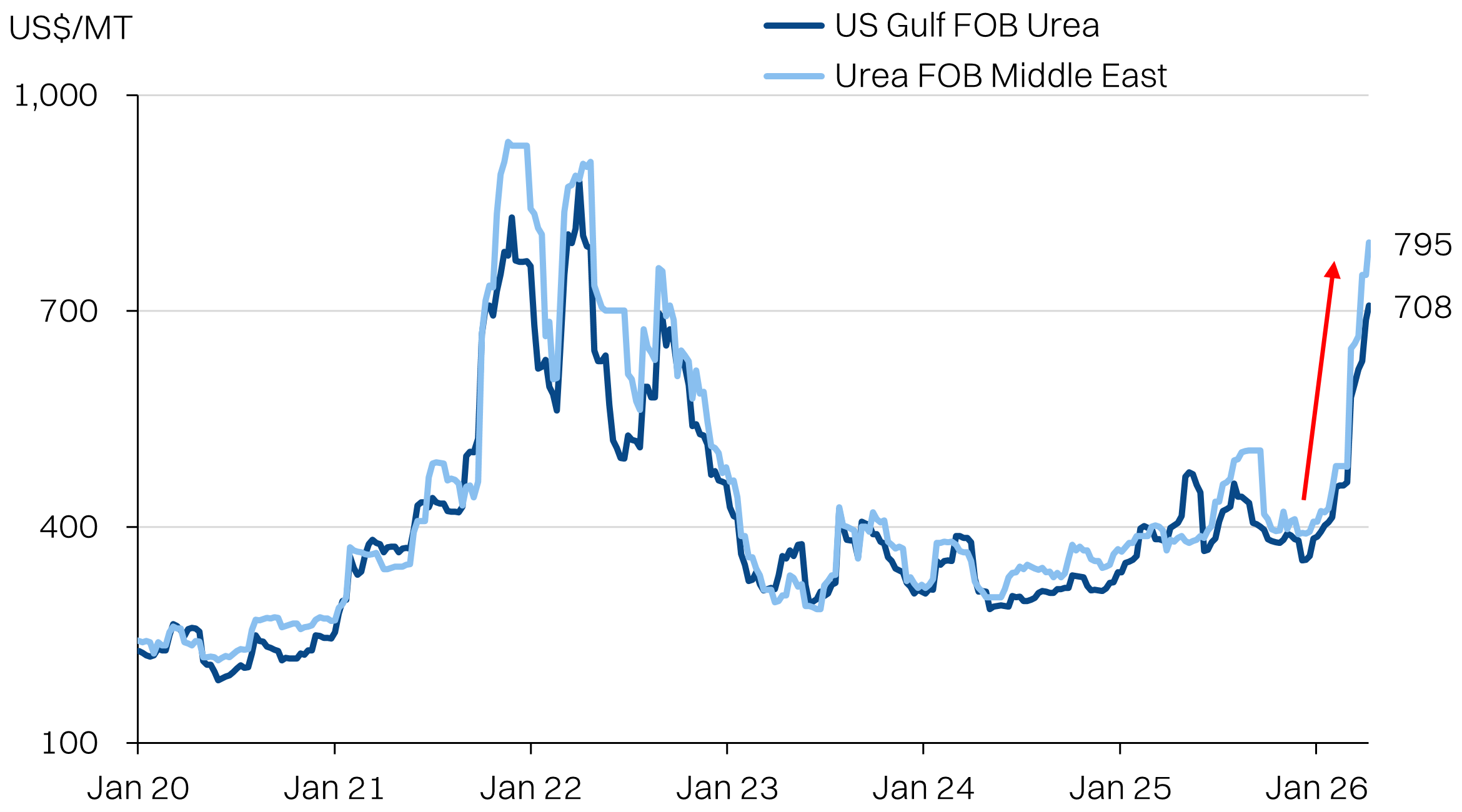 Urea is the primary synthetic nitrogen fertiliser in use and prices are up +65% since the war began. It is simply because one-third of the global urea and urea precursors originate from the Middle East. Urea is made from ammonia which is in turn made from natural gas via the Haber-Bosch process. This means the global LNG shortages will also drive-up urea prices. Iran is the fourth-largest exporter of urea after Russia, Egypt and Saudi Arabia.