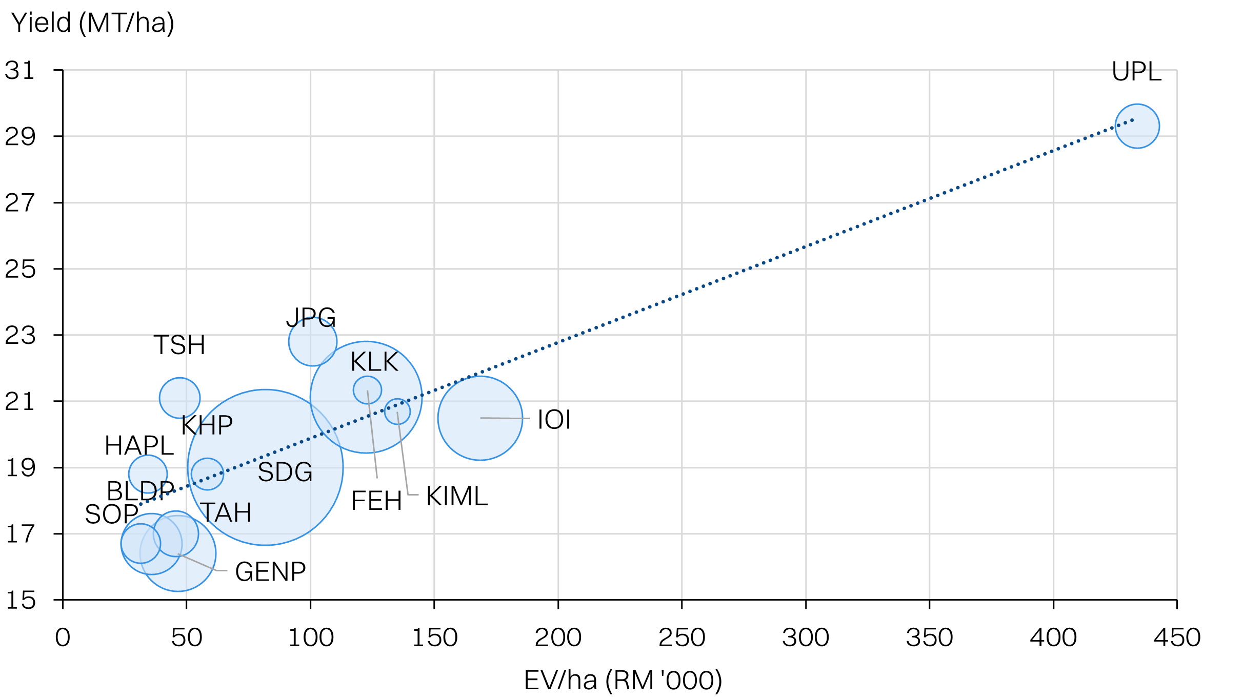 United Plantations (UPL) is the sector outlier for yields at >29MT/ha. However, this is well priced-in. Looking at relative valuations to yield, TSH Resources (TSH) and Johor Plantations Group (JPG) are the clear outliers. Followed by Kuala Lumpur Kepong (KLK) and Hap Seng Plantations.