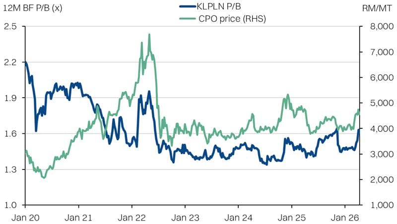 This picture is less alarming when looking at valuations. The index’s price-to-book multiple is near a 4-yr high of 1.6x, but remains below the long-run average of 1.7x. It is above the 3-yr average of 1.5x but that is reasonable given the elevated CPO prices. PER ratios paint a similar picture, at 16.8x 12MBF PER, the index is still below the long-run average of 19.4x but slightly above the 3yr average of 16.4x.