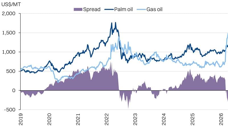 Indonesia in 2024 implemented a 40% biodiesel blending mandate (B40) but initially delayed the rollout of the B50 mandate in January this year. The government indicated that it could be revisited by end-26 for a 2027 implementation. Since the spike in oil prices, the government has announced that it will now implement B50 by July 2026. With the ceasefire however, B50 could be postponed again.