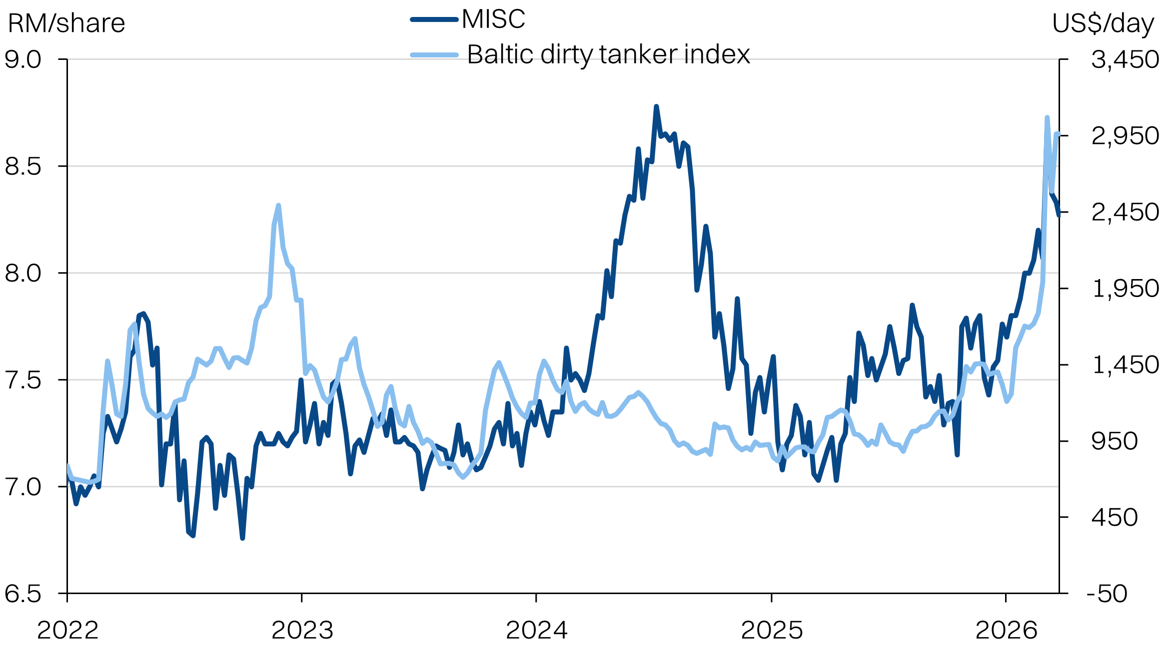 - Historically, tanker rates have been a strong driver for MISC’s share price performance, but earnings transmission from this rally should be especially soft since MISC eschews risky routes like the ones that are driving benchmark rates.