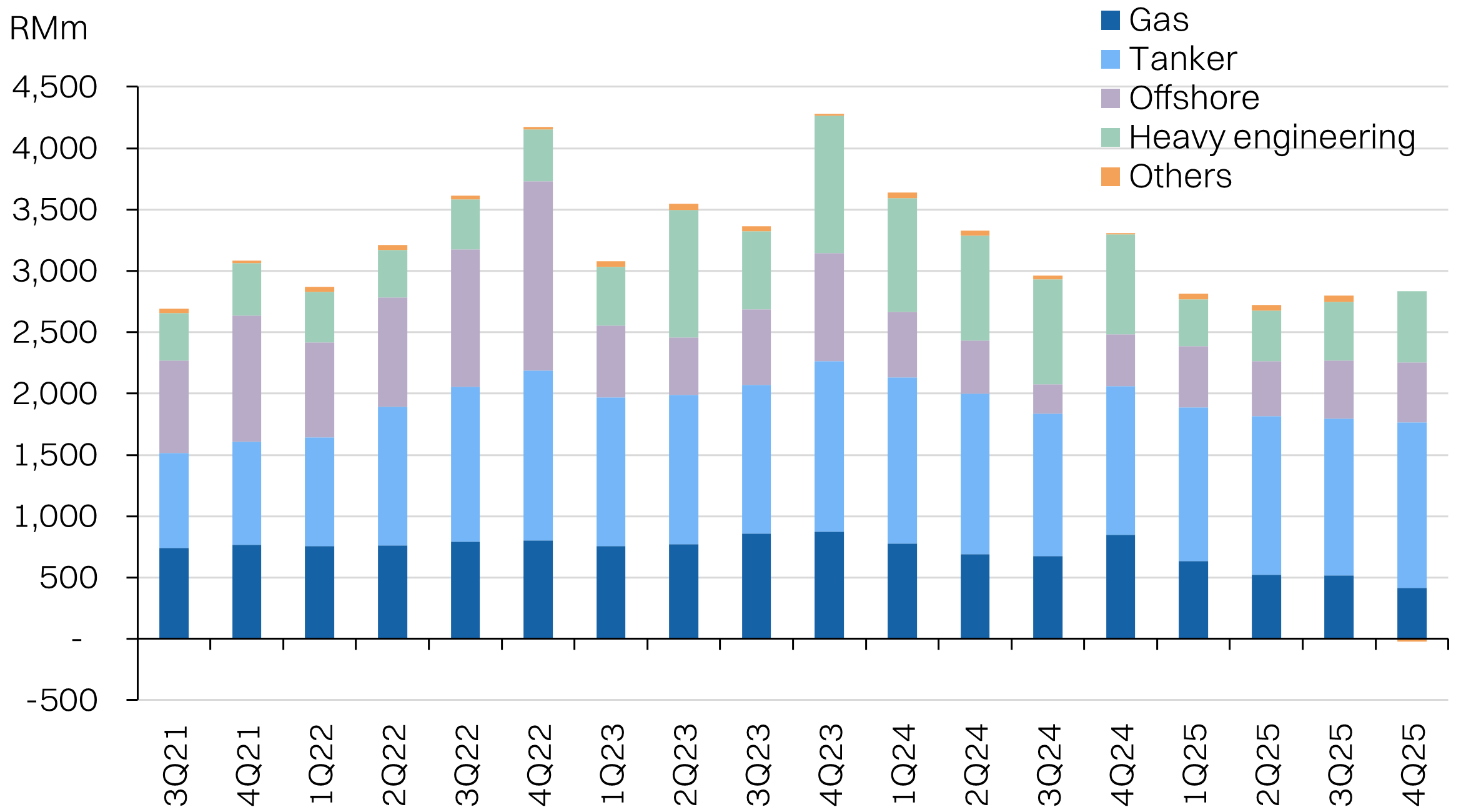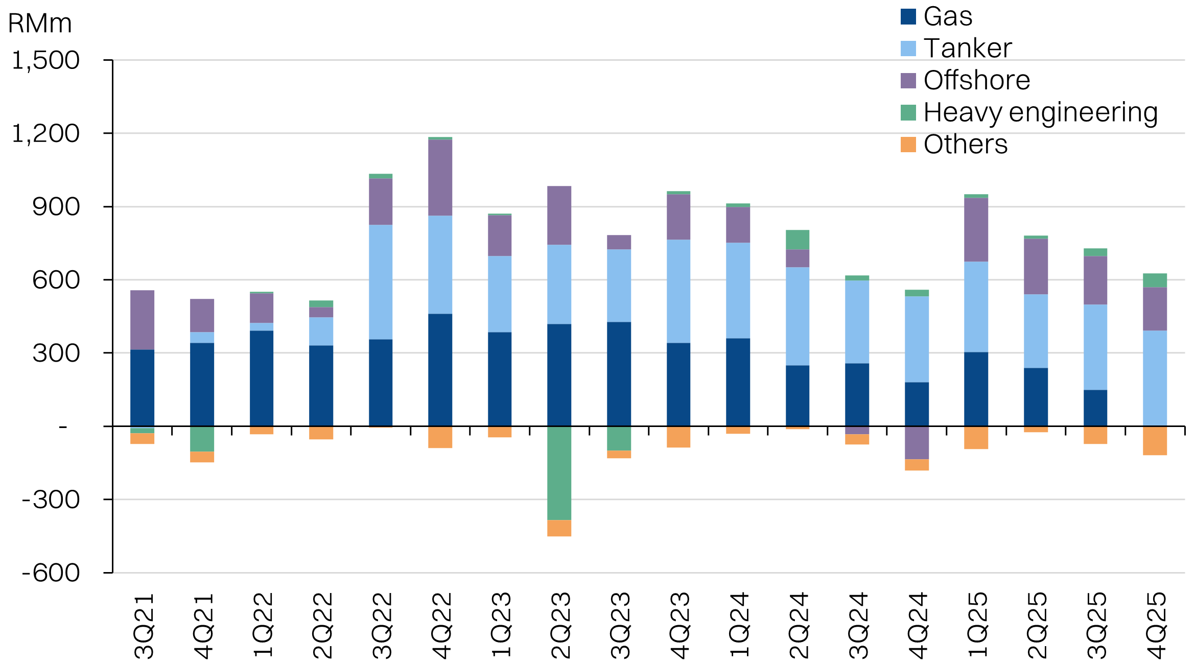 - While 4Q25 is not representative due to some one-off impairments in the Gas segment, broadly, contributions from gas have fallen from ~40% of operating profits to ~30%.
