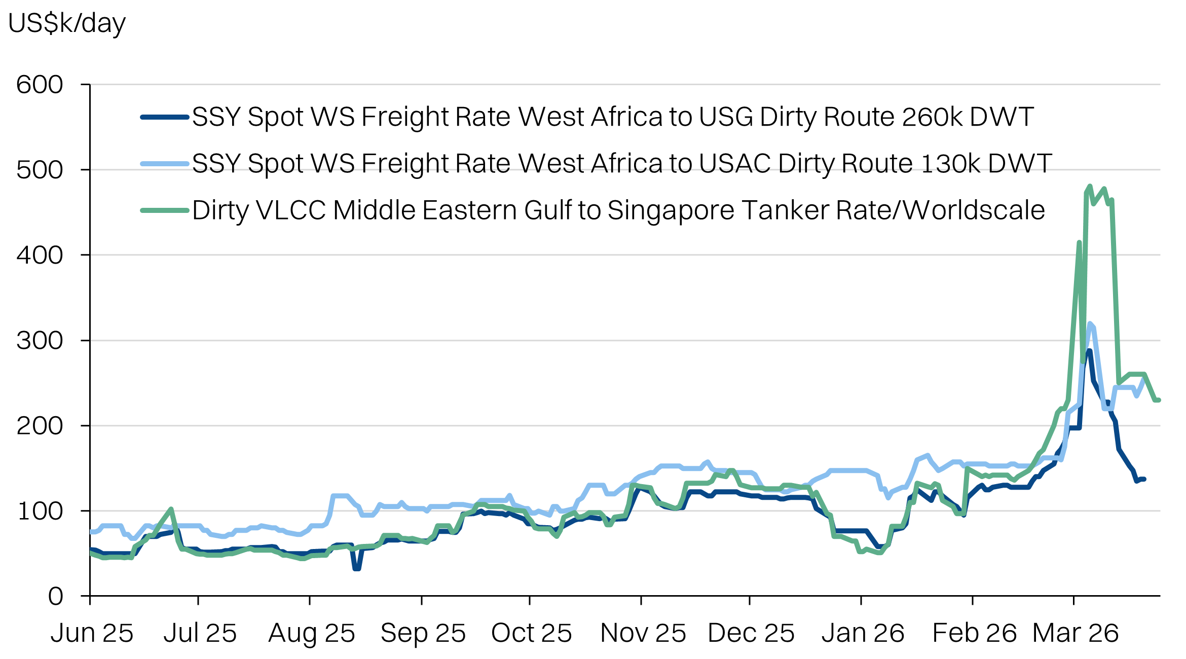 - Unlike previous rallies in tanker rates, the closure of the Strait of Hormuz has had a disproportionate impact on routes from the Persian Gulf to reflect the elevated risk and demand.