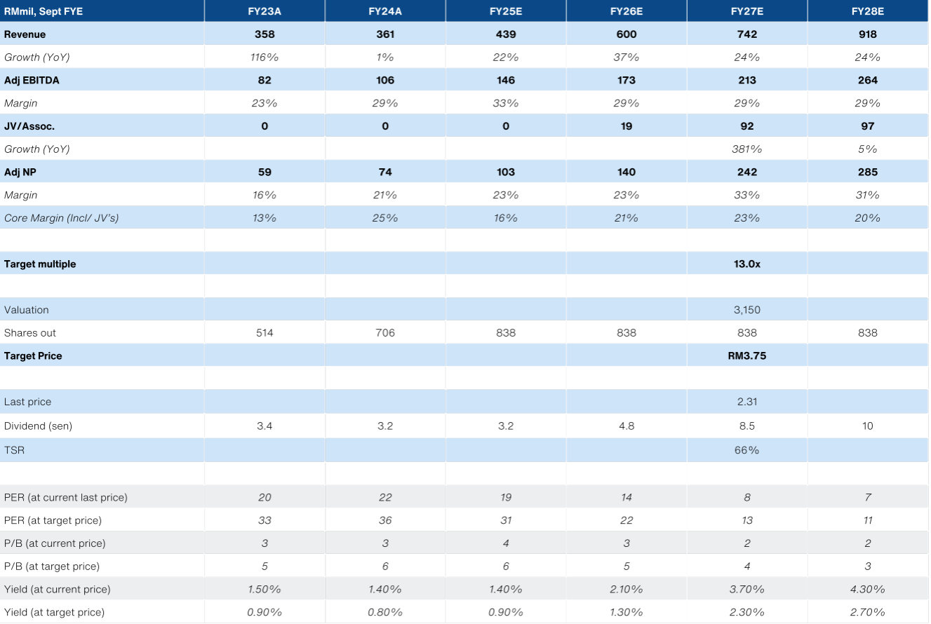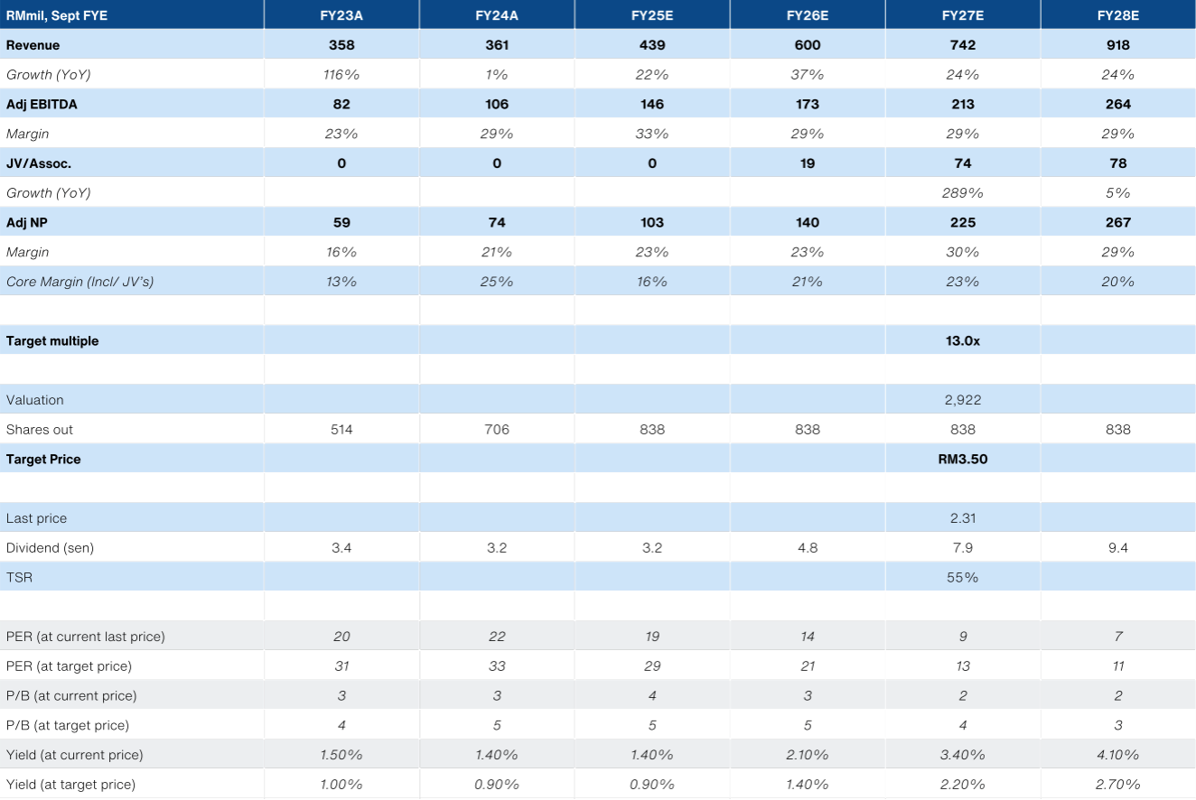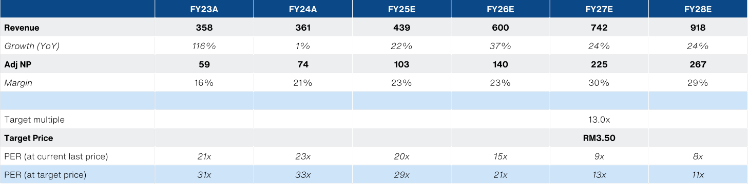 - Initiate coverage with a BUY and target price of RM3.50, which implies only 11x FY27E PER.