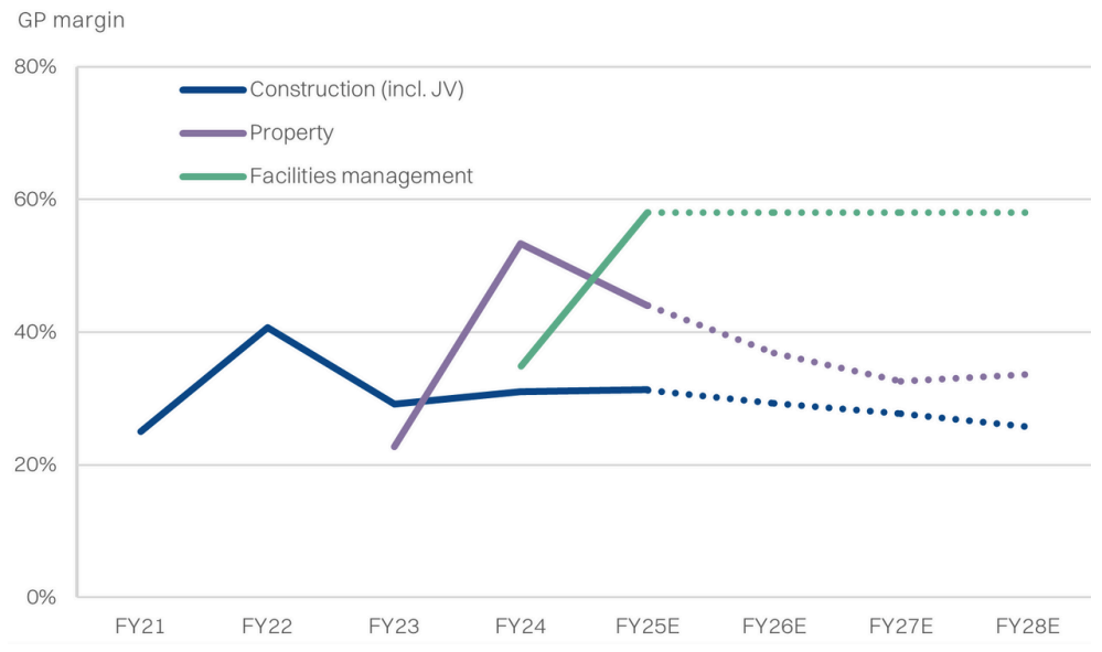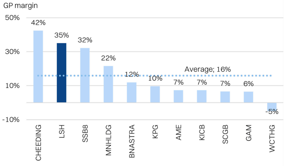 LSH Capital’s construction GP margins of 35% is exceptional among its peers, roughly double the sector average that languishes in the mid-teens. In fact, LSH Capital’s GP margins are more comparable to specialist construction players like Cheeding, Southern Score Builders and MN Holdings. Civil works contractors typically deliver GP margins in the high single digits.
